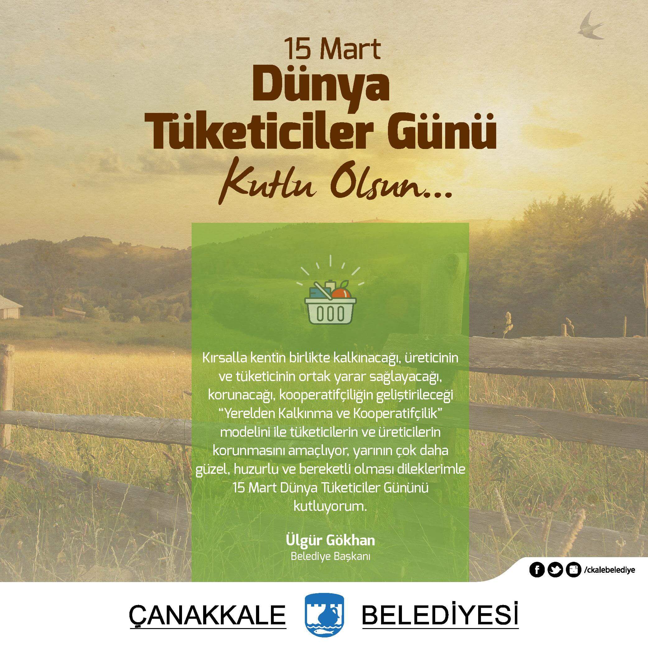 Kırsalla kentin birlikte kalkınacağı, üreticinin ve tüketicinin ortak yarar sağlayacağı, korunacağı, kooperatifçiliğin geliştirileceği "Yerelden Kalkınma ve Kooperatifçilik" modeli ile tüketicilerin ve üreticilerin korunmasını amaçlıyor, yarının çok daha güzel, huzurlu ve bereketli olması dileklerimle 15 Mart Dünya Tüketiciler Gününü kutluyorum.