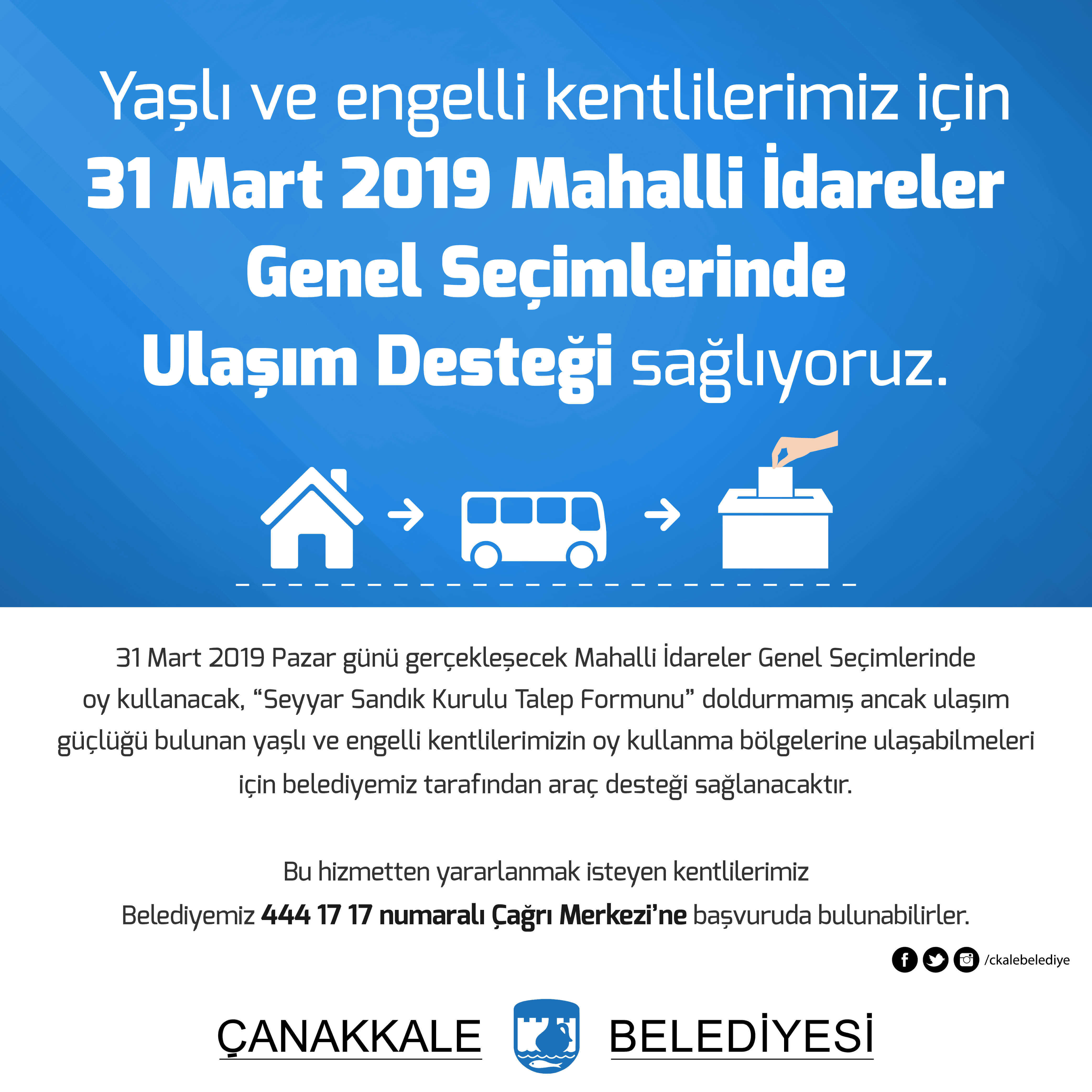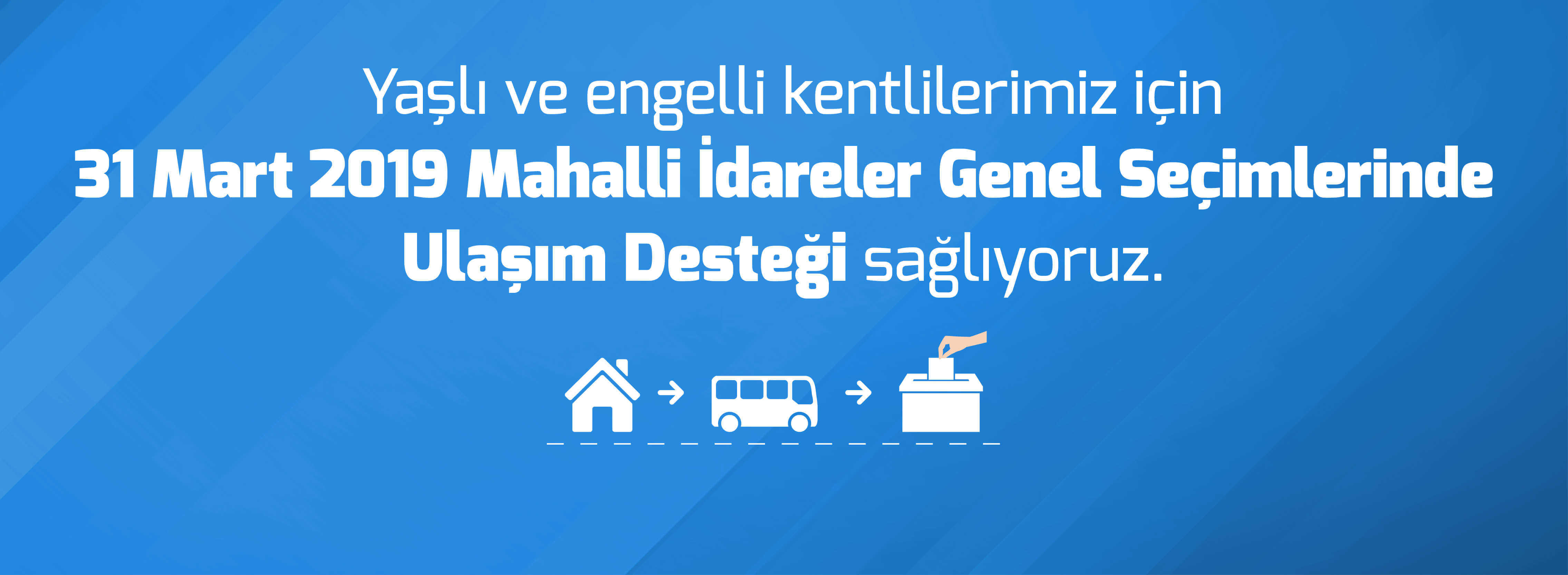 Yaşlı ve engelli kentlilerimiz için 31 Mart 2019 Mahalli İdareler Genel Seçimlerinde ulaşım desteği sağlıyoruz.