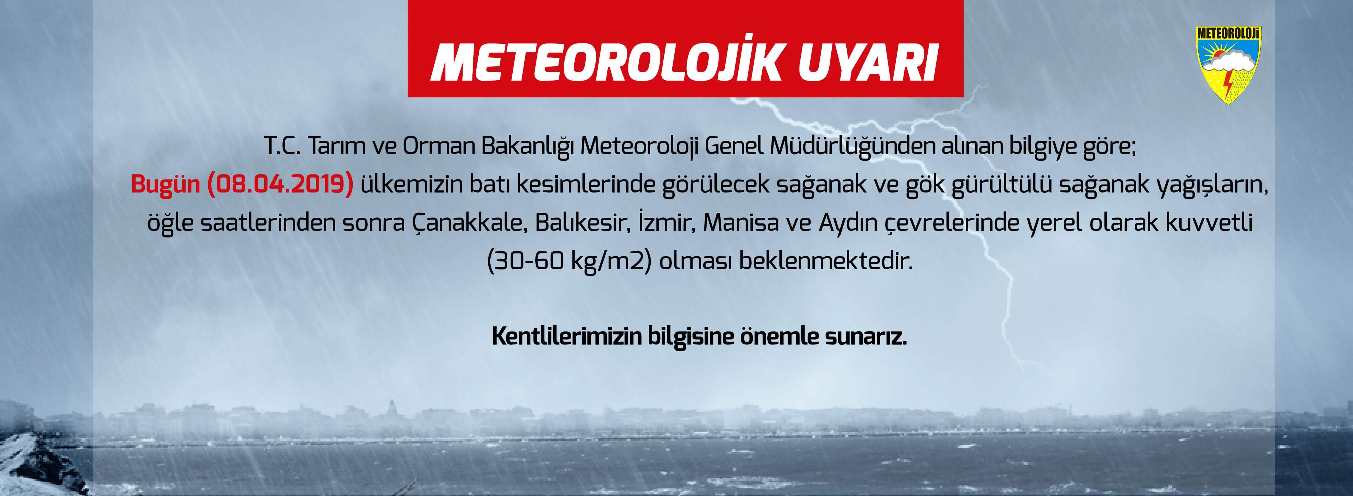 Bugün ülkemizin batı kesimlerinde görülecek sağanak ve gök gürültülü sağanak yağışların, öğle saatlerinden sonra Çanakkale, Balıkesir, İzmir, Manisa ve Aydın çevrelerinde yerel olarak kuvvetli (30-60 kg/m2) olması beklendiğinden meydana gelebilecek ani sel, su baskını, yıldırım, yerel dolu yağışı, yağış anında kuvvetli rüzgar gibi olumsuzluklara karşı dikkatli ve tedbirli olunması gerekmektedir.