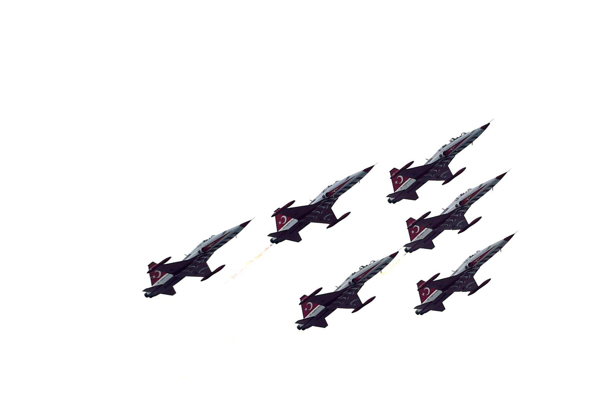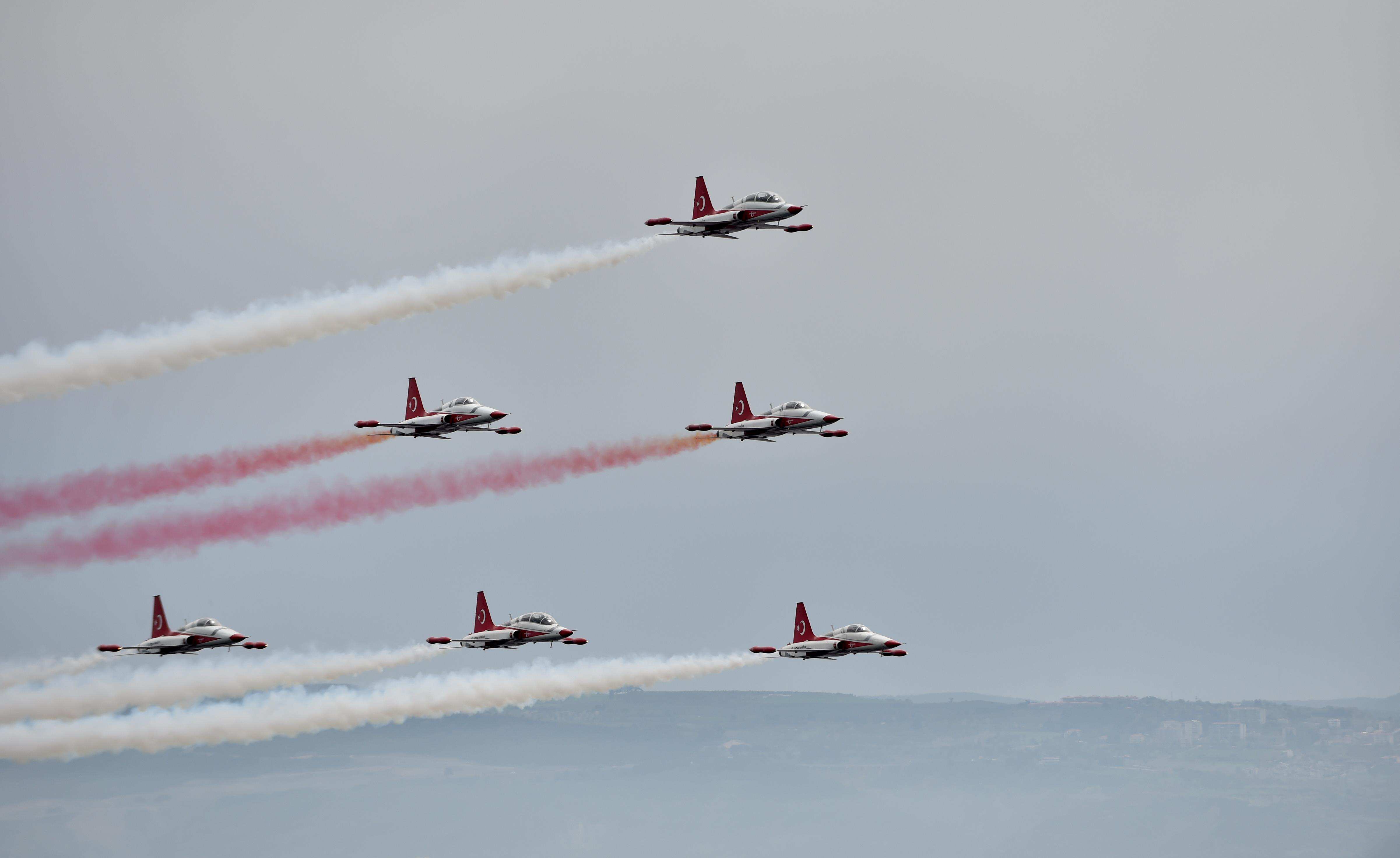 Törenlerde Türk Yıldızları da gökyüzünde büyük beğeni toplayan bir gösteri sundu.