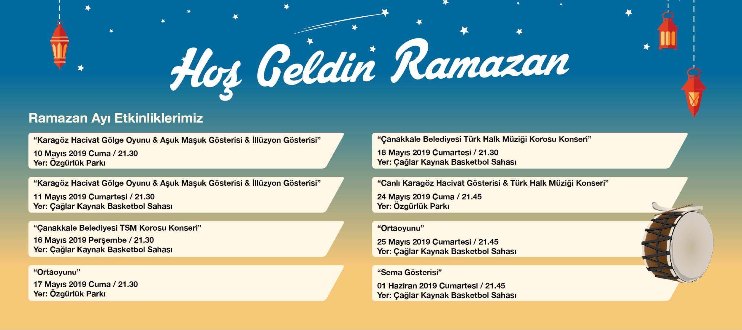 Çanakkale Belediyesi tarafından düzenlenen Ramazan etkinlikleri, 10 Mayıs 2019 Cuma günü saat 21:30'da Özgürlük Parkı'nda sahnelenecek olan Karagöz Hacivat Gölge Oyunu, Aşuk Maşuk Gösterisi ve İllüzyon Gösterisi ile başlayacak.