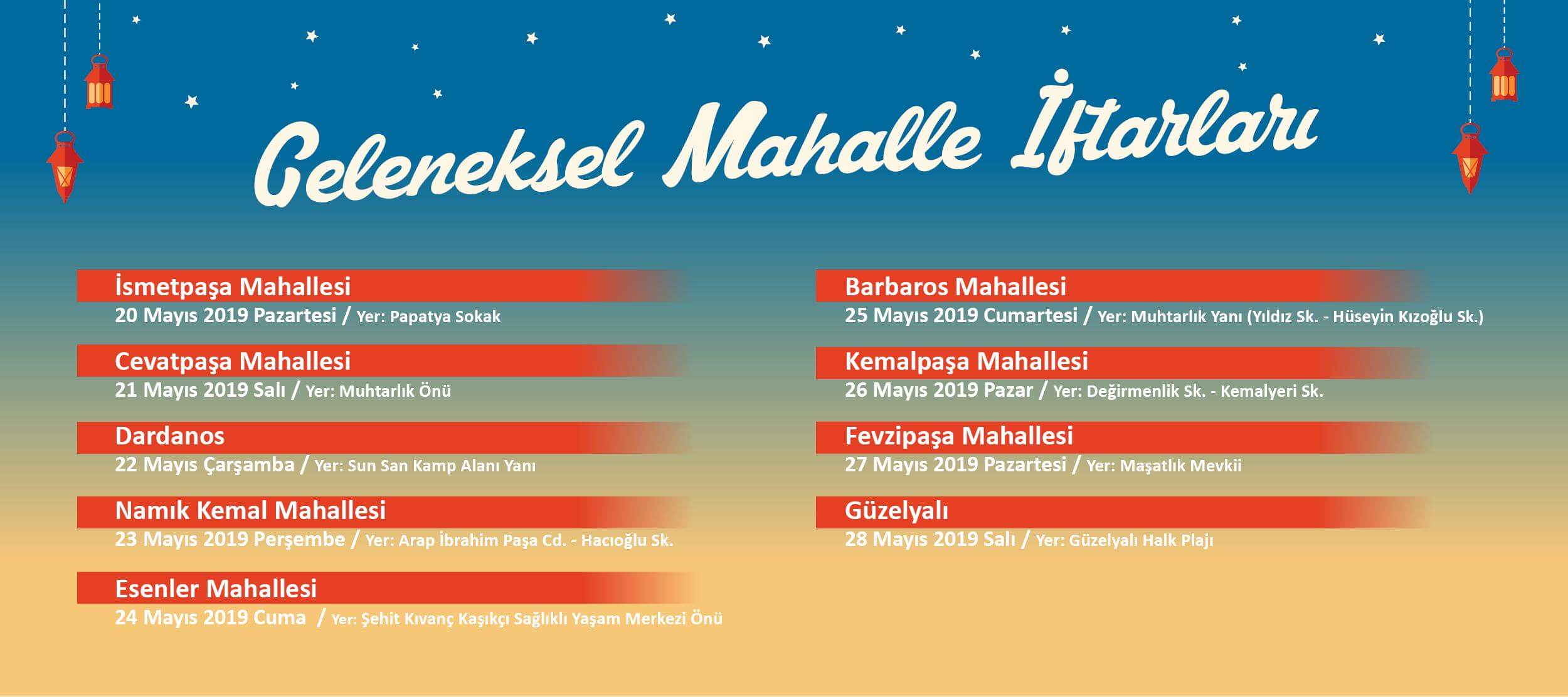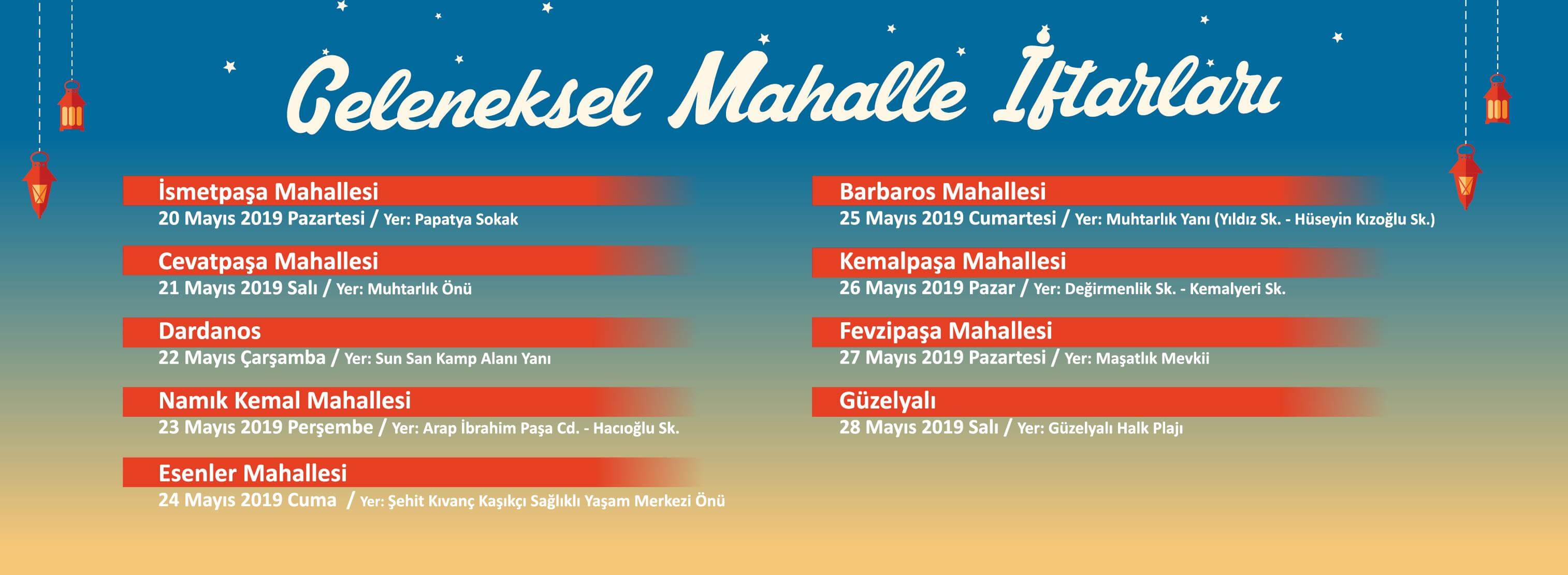 Çanakkale Belediyesinin, Kent Konseyi Mahalle Meclisleri ve Mahalle Muhtarlıklarının ortaklığında geleneksel olarak düzenlediği mahalle iftarları, bu yıl da 20 Mayıs 2019 Pazartesi günü başlıyor.