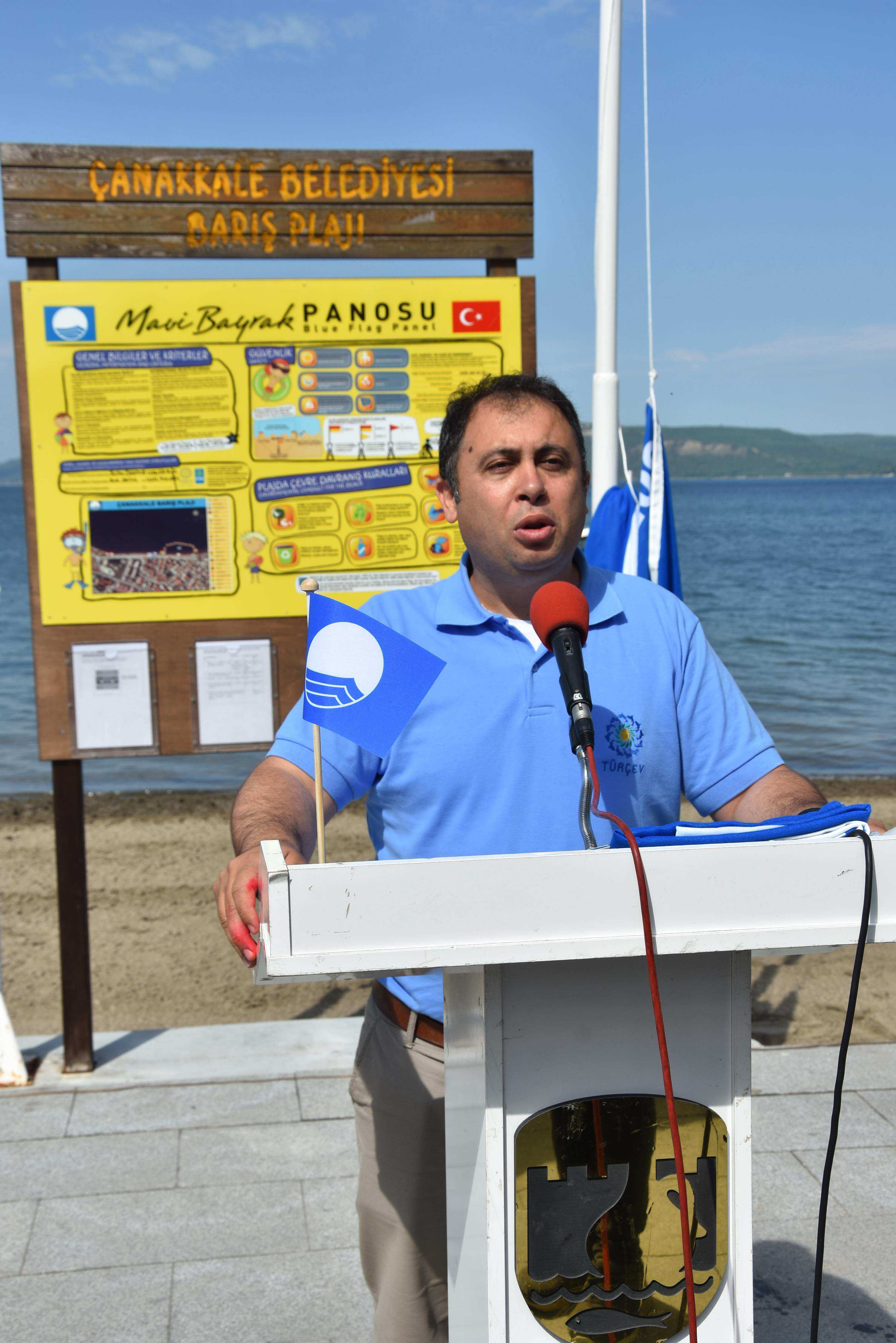 Etkinlikte ilk olarak konuşma yapan Türkiye Çevre Eğitim Vakfı (TÜRÇEV) Kuzey Ege İlleri Koordinatörü Doğan Karataş, Mavi Bayrak etkinliklerini çok önemsediklerini ifade ederek, “1993 yılından bu yana Mavi Bayrak çalışmasını yürütüyoruz. Mavi bayrak denince akla ilk gelen deniz temizliği oluyor. Ancak Mavi bayrak aynı zamanda güvenli, sağlıklı, temiz bir çevrenin de sembolüdür. 33 kriterimiz var. Plajlarımızı bu 33 kriter çerçevesinde değerlendiriyoruz. Her zaman söylediğimiz bir şey var; mavi bayrağı almak zor fakat kaybetmek çok kolaydır. Çanakkale’de de gelenekselleşen törenlerimizin 5.’sini gerçekleştiriyoruz. Bu sene biri kent merkezinde Mega Beach, bir diğeri de gerçekten çok güzel olan Güzelyalı Halk Plajı. 5 sene içerisinde 1 olan mavi bayrak sayısı 3’e çıkmış bulunuyor. Bu sayının artacağını düşünüyorum. Türkiye’de mavi bayraklı 463 plaj var. Bu haliyle dünyada 3. Sıradayız. Hedefimiz ise dünya birinciliği” diye konuştu.