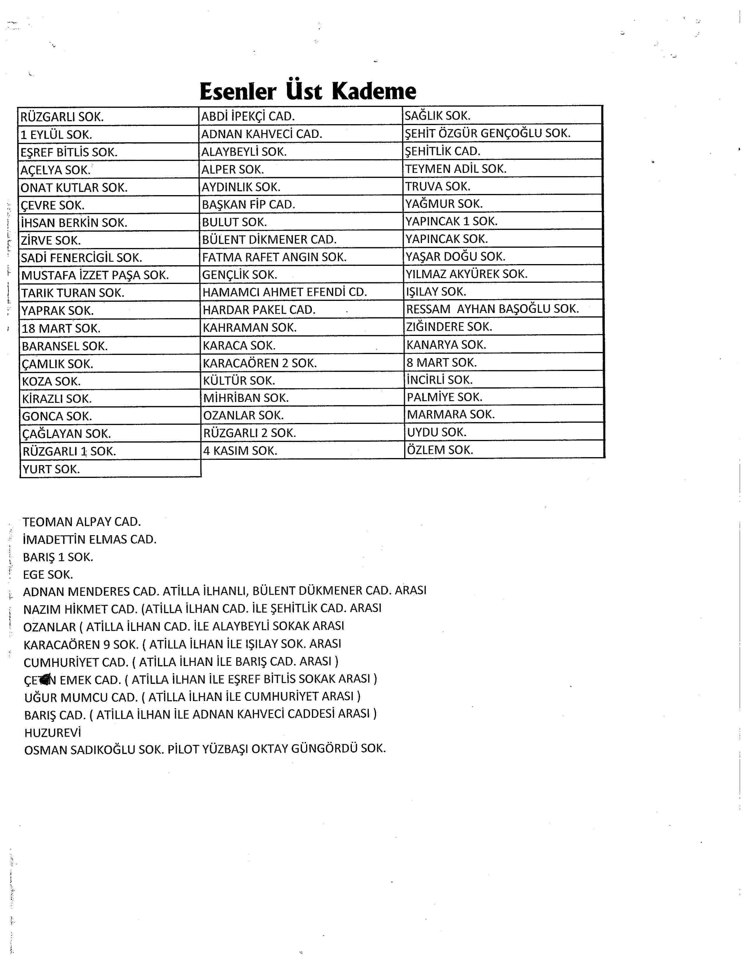 İçme Suyu hatlarında yapılacak bakım onarım çalışması nedeniyle, Esenler Mahallesi'nde ekli haritada gösterilen bölgelerde 4 Temmuz 2019 Perşembe günü 13.30-17.00 saatleri arasında su kesintisi yaşanacaktır. Gerekli önlemleri almaları hususunda kentlilerimizin bilgisine sunarız.