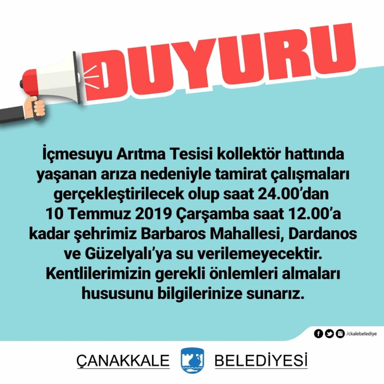 İçmesuyu Arıtma Tesisi kollektör hattında yaşanan arıza nedeniyle tamirat çalışmaları gerçekleştirilecek olup saat 24.00’dan 10 Temmuz 2019 Çarşamba saat 12.00’a kadar şehrimiz Barbaros Mahallesi, Dardanos ve Güzelyalı’ya su verilemeyecektir. Kentlilerimizin gerekli önlemleri almaları hususunu bilgilerinize sunarız.