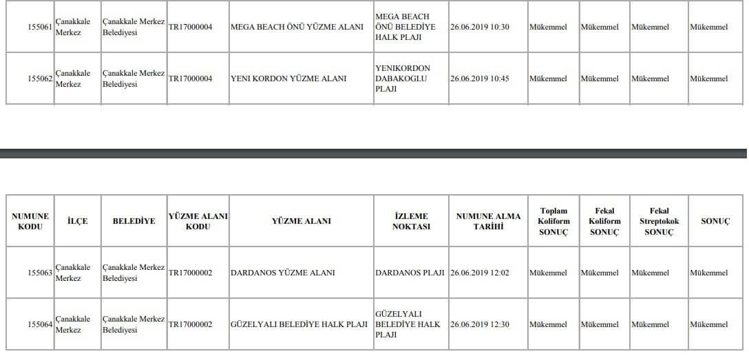 T.C. Sağlık Bakanlığı Çanakkale İl Sağlık Müdürlüğünün web sitesinde yayınladığı Çanakkale İli Yüzme Suyu Hakkında yapılan kamuoyu bilgilendirmesine göre, kent merkezinde bulunan Çanakkale plajlarının yüzme suyu analiz sonuçları “mükemmel” değerdedir.