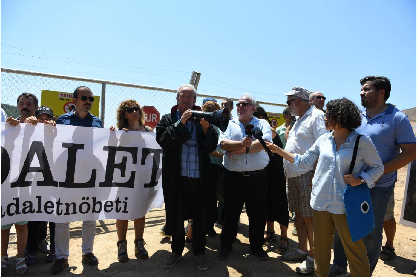 Çanakkale'nin suyuna, toprağına ve doğal yaşamına sahip çıkmak için başlatılan “Su Nöbeti”e destek her geçen gün büyüyor. Su nöbetinin 7. gününde Adalet Nöbeti Avukatları da Kirazlı-Balaban Mevkiine ziyarette bulundu. İstanbul Barosuna bağlı Adalet Avukatlarına, CHP Çanakkale Milletvekili Özgür Ceylan, Belediye Başkan Yardımcıları İrfan Mutluay ve Rebiye Ünüvar ile Çanakkale Barosu Çevre Komisyonu da eşlik etti. Maden sahasında yapılan inceleme sırasında Başkan Yardımcısı Mutluay, yapılan doğa katliamına ilişkin bilgiler verdi. İncelemenin ardından konuşan İstanbul Barosu Avukatlarından Kemal Aytaç; “Türkiye'nin her yerinde adalet mücadelesini sürdüren avukatlar olarak; belki de şimdiye kadar gündemimize aldığımız, katkıda bulunduğumuz, dayanışma gösterdiğimiz en önemli en temel olaylardan birisi su ve vicdan hürriyeti. Bu ülkede son yıllarda nöbetler çoğaldı. Birçok konuda insanlar nöbete duruyor. Bütün baskılara, zorluklara rağmen insanlar canları ve kanları pahasına nöbetlere duruyorlar. Öncelikle İstanbul'dan Adalet Nöbeti adına gelen avukatlar olarak burada bu mücadeleyi sürdüren su ve vicdan nöbetinin öncülünü yapan tüm dostlarımızı selamlıyoruz ve sizlerle dayanışmak için buradayız. Nerede bir adaletsizlik oluyor ve bizler buna susuyorsak, dün Bergama'da, İstanbul'da Türkiye'nin her yerinde her alanda haksızlığa susuyorsak bu haksızlık bir gün mutlaka bizim kapımızı da çalar. Bu hıyanete, bu ahlaksızlığı mutlaka dur demeliyiz. Bunu Kazdağlarında durduramazsak başka yaşam alanlarımız da yok edilecek. Bu aç gözlülüğün, vahşi kapitalizmin saldırısına karşı her yerde mücadele etmeliyiz. Adalet Nöbetlerini, su ve vicdan nöbetlerini sürdürmek zorundayız” dedi.