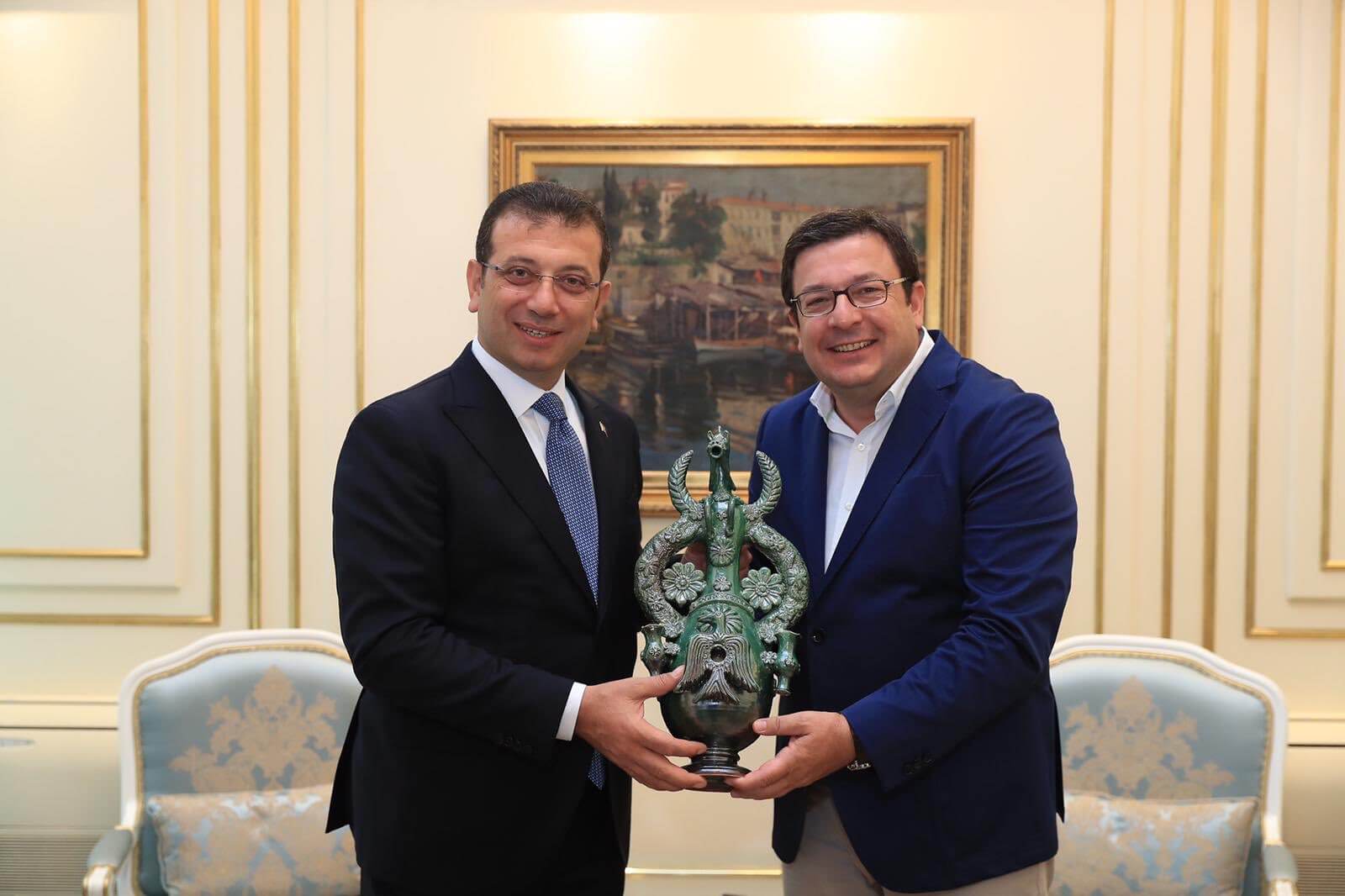 Sohbet ortamında geçen ziyarette İmamoğlu, Büyükşehir Belediyesi çalışmaları hakkında bilgiler verdi. Ziyaret sonunda Başkan Gökhan ve Erkek, İmamoğlu’na geleneksel Çanakkale Seramiği ve kente özgü objeler takdim etti.