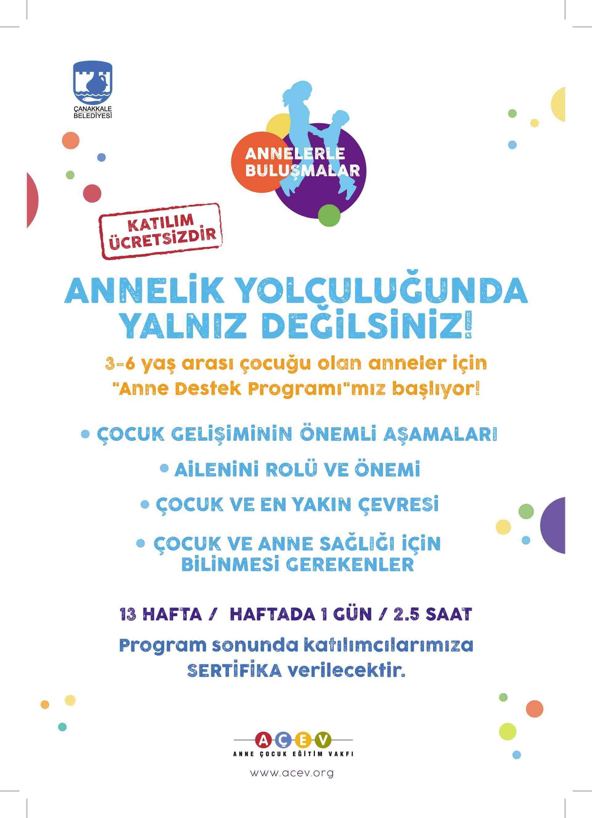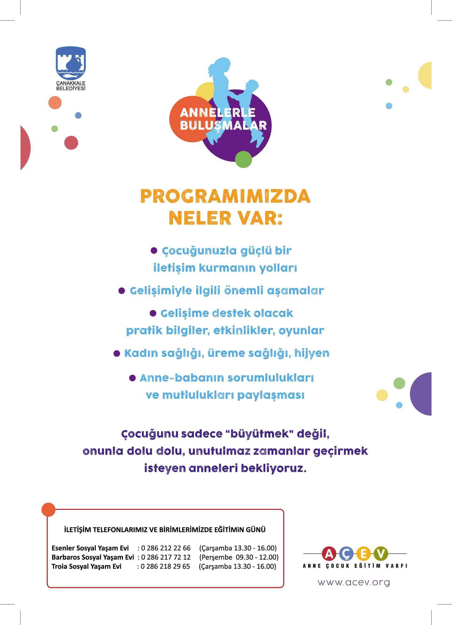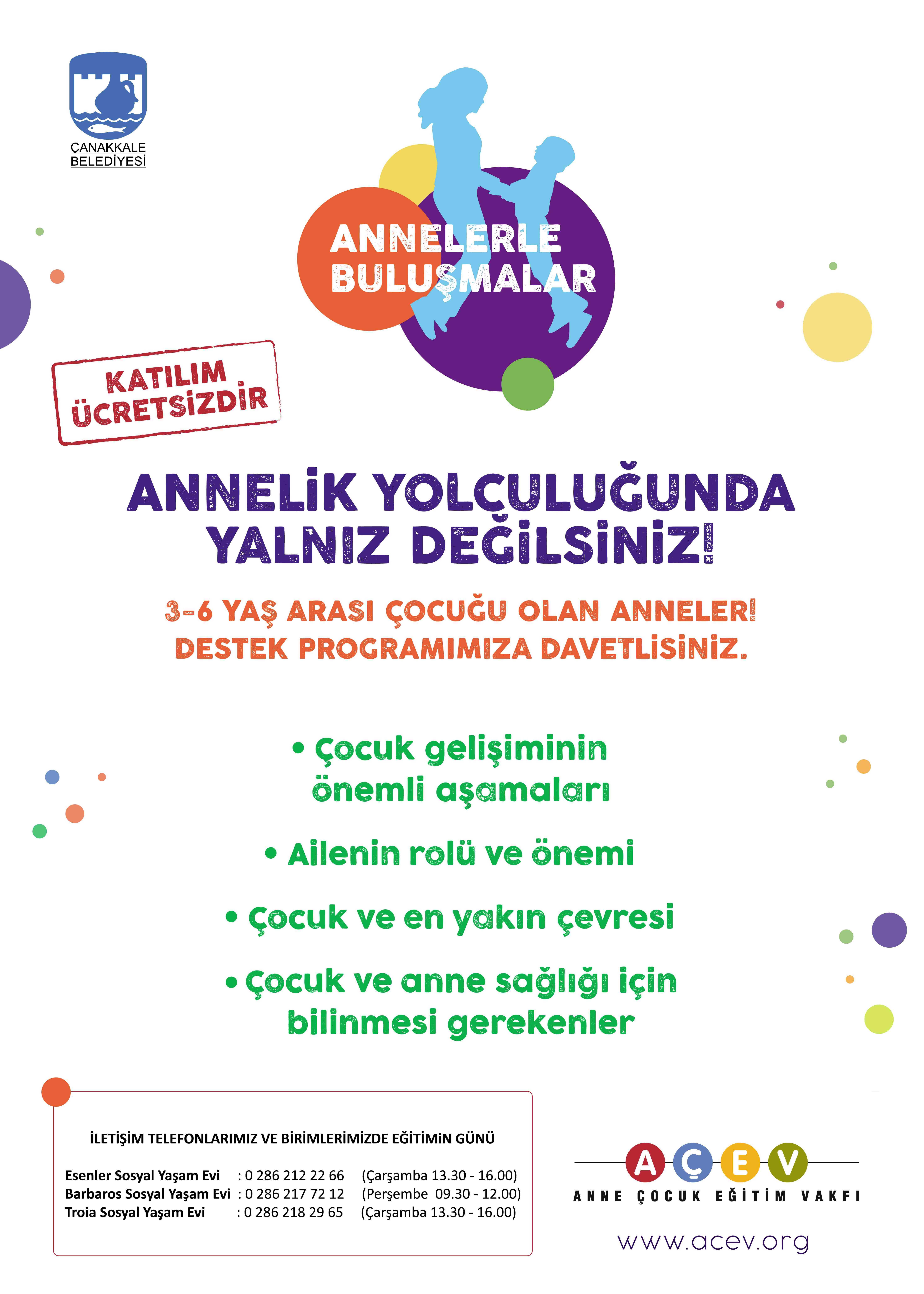 Çanakkale Belediyesi Troia, Barbaros ve Esenler Sosyal Yaşam Evleri’nde, 2 Eylül 2019 Pazartesi günü itibariyle Anne Çocuk Eğitim Vakfı ile ortak olarak düzenlenen Anne Destek Eğitimi ile Baba Destek Eğitimi gruplarının kayıtları başlayacak.
