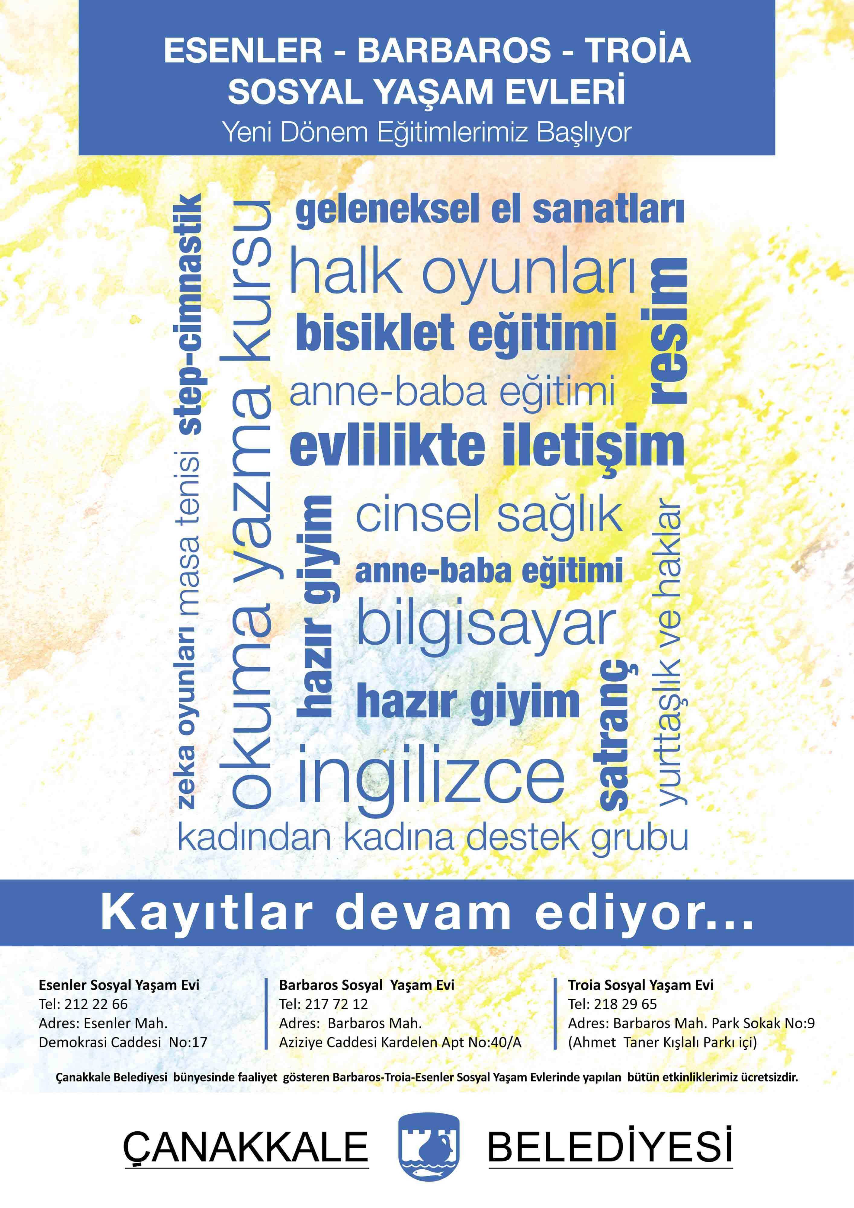 Çanakkale Belediyesi Troia, Barbaros ve Esenler Sosyal Yaşam Evleri’nde, yetişkinlere ve çocuklara yönelik düzenlenen ücretsiz etkinlikler, atölye ve grup çalışmaları için yeni dönem kayıtları 2 Eylül 2019 Pazartesi günü itibariyle başlıyor.