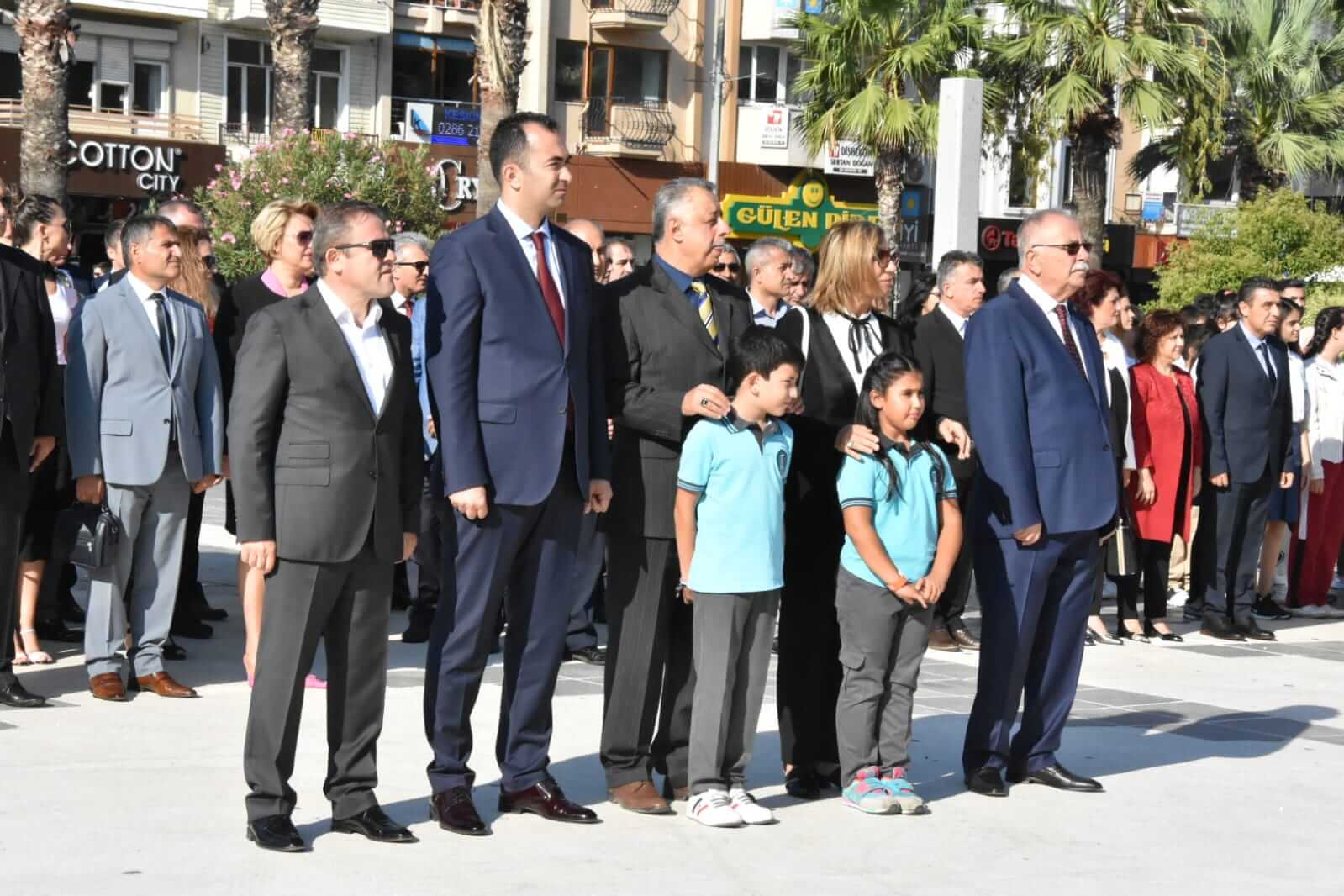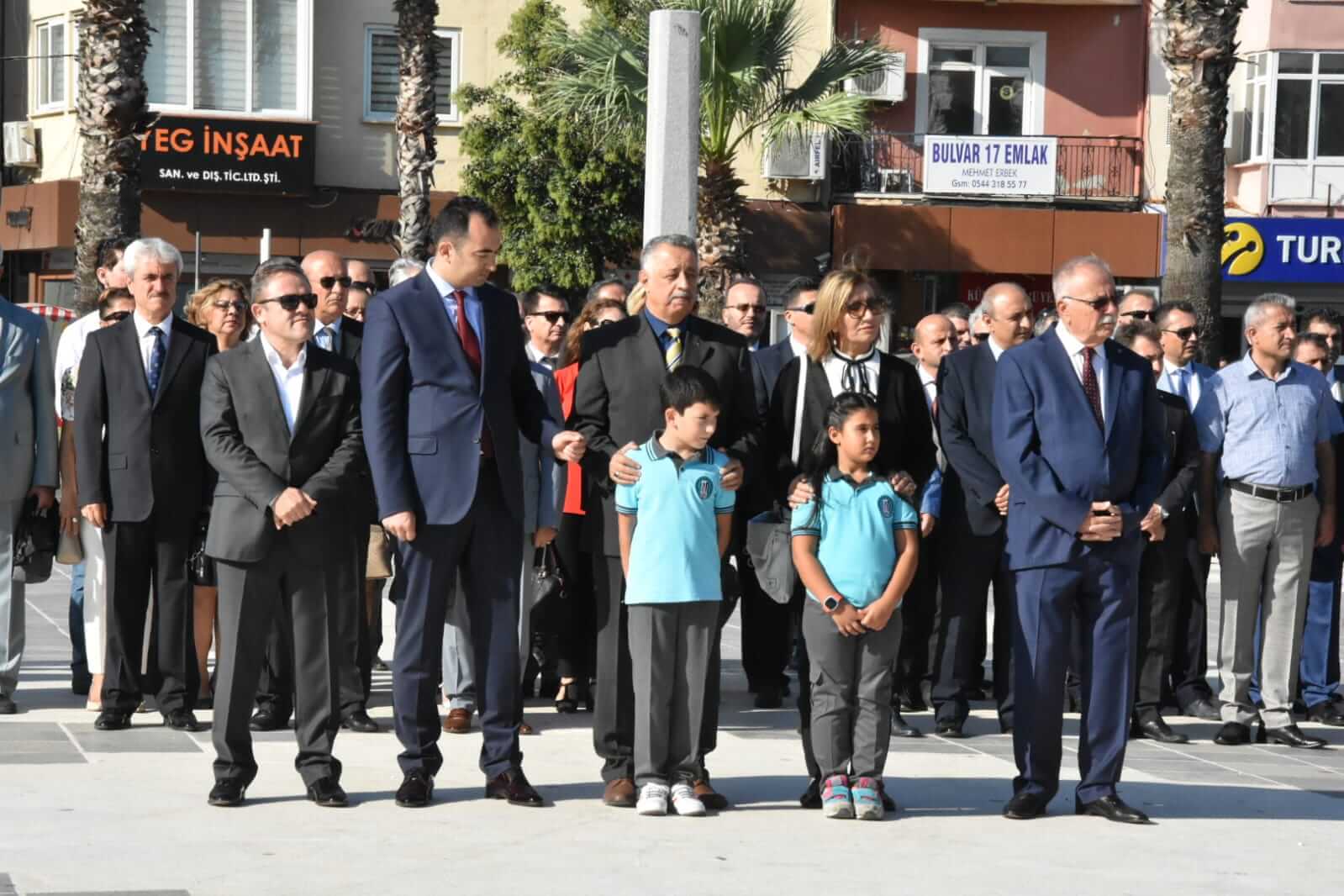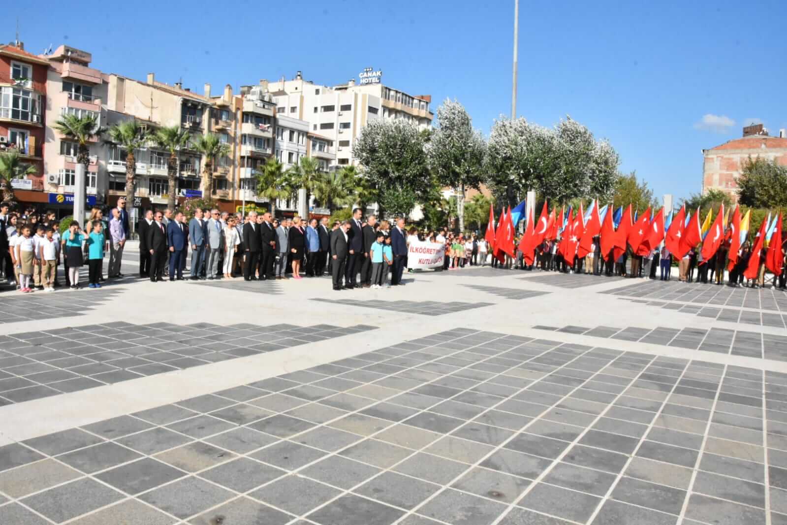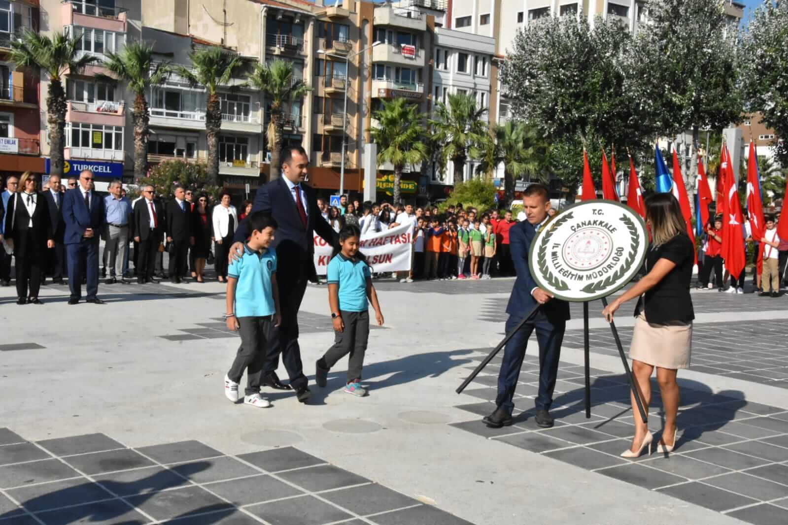 İlköğretim Haftası Kutlama programı kapsamında ilk olarak Cumhuriyet Meydanı'nda çelenk sunma töreni gerçekleştirildi. Törene Vali Yardımcısı Celil Ateşoğlu, Çanakkale Boğaz ve Garnizon Komutanı Tuğamiral Levent Kerim Uça, Belediye Başkanı Ülgür Gökhan ile öğretmen ve öğrenciler katıldı. Atatürk Anıtına çelenk sunulmasının ardından saygı duruşu ve İstiklal Marşı'nın okunması ile tören sona erdi.