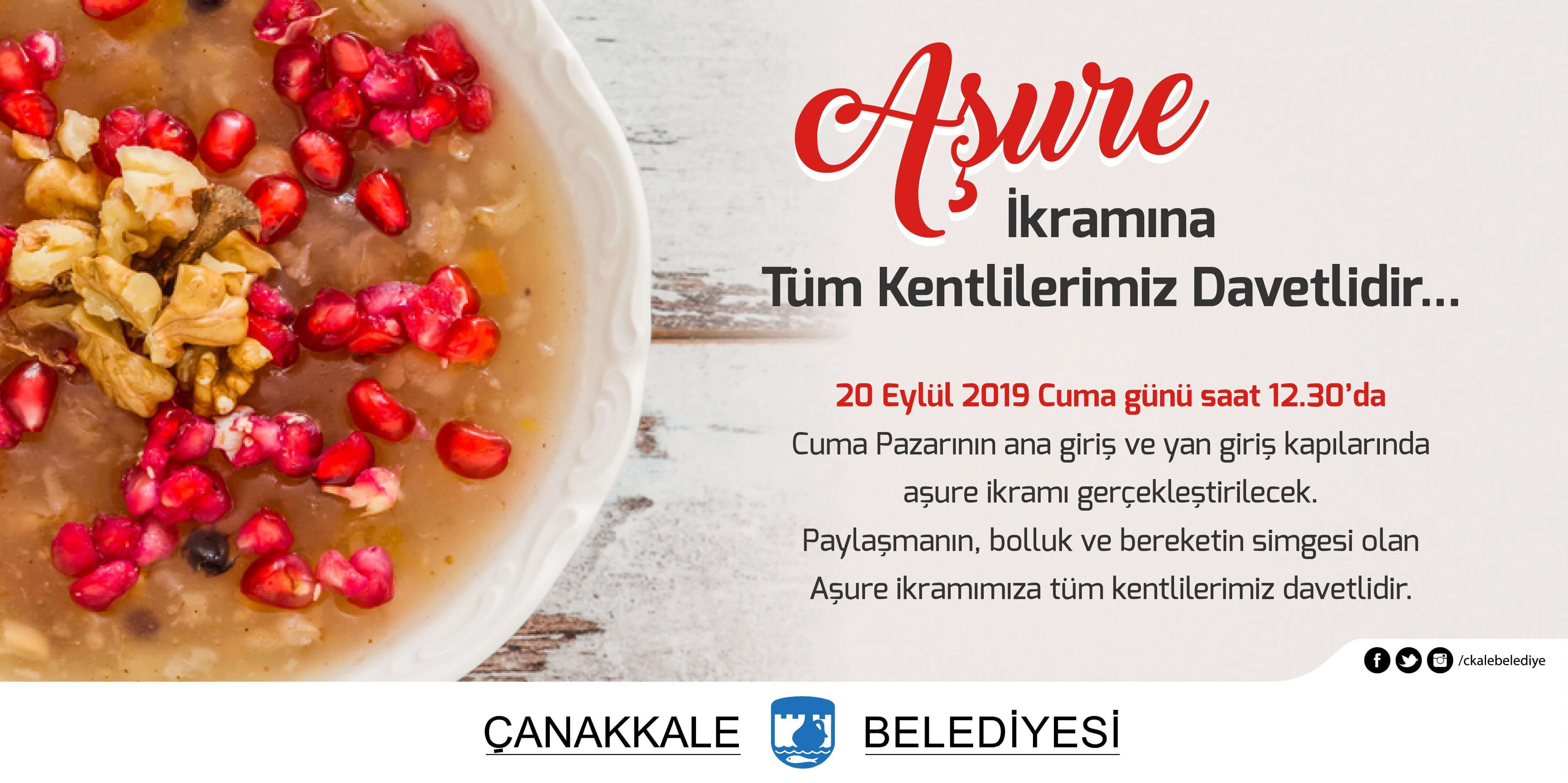 Çanakkale Belediyesi tarafından 20 Eylül 2019 Cuma günü saat 12.30’da Cuma Pazarının ana giriş ve yan giriş kapılarında aşure ikramı gerçekleştirilecek.