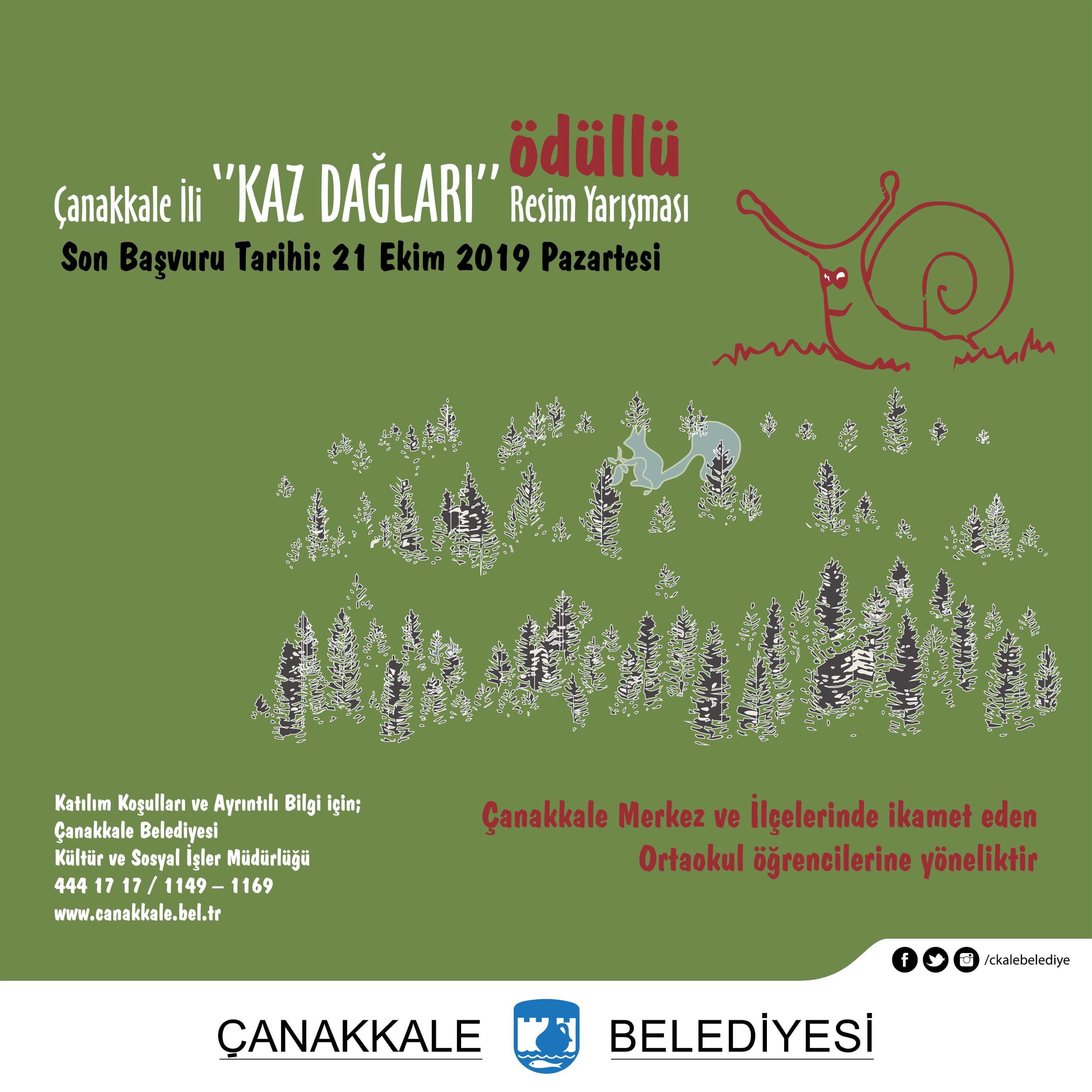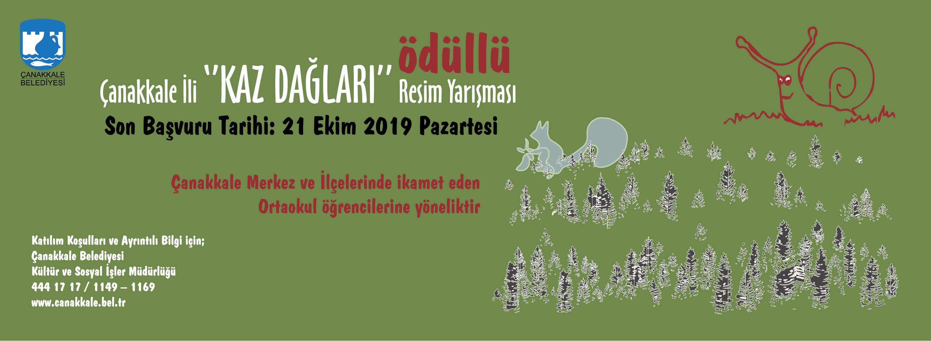 “Kaz Dağları” konulu resim yarışması için başvurular, 20 Eylül 2019 Cuma gününden itibaren başladı. Çanakkale Merkez ve ilçelerinde ikamet eden ortaokul öğrencilerini kapsayan yarışmada başvurular, 21 Ekim 2019 Pazartesi günü sona erecek.