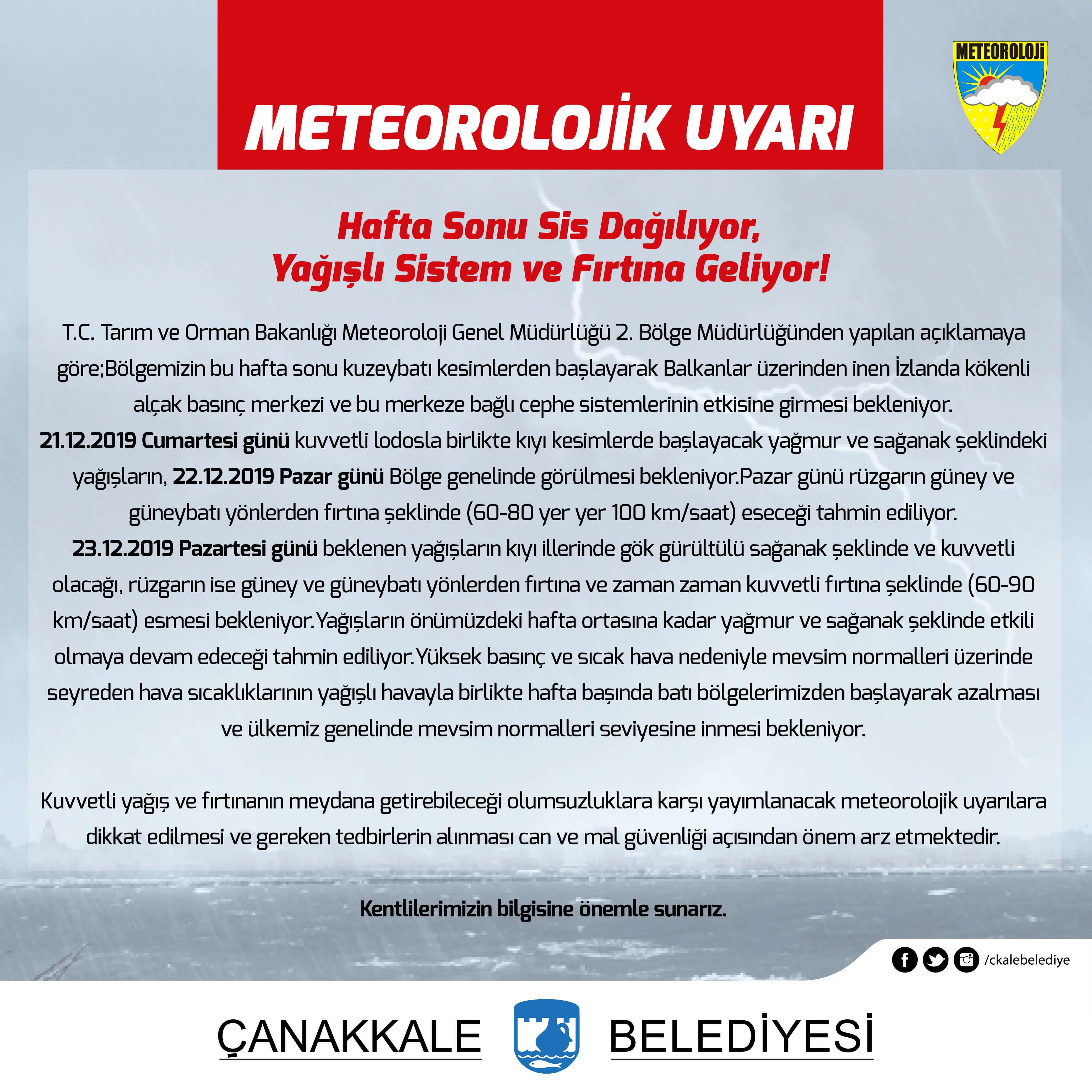 23.12.2019 Pazartesi günü beklenen yağışların kıyı illerinde gök gürültülü sağanak şeklinde ve kuvvetli olacağı, rüzgarın ise güney ve güneybatı yönlerden fırtına ve zaman zaman kuvvetli fırtına şeklinde (60-90 km/saat) esmesi bekleniyor.