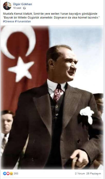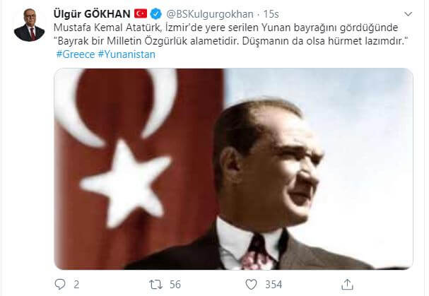 Belediye Başkanı Ülgür Gökhan da, Türk Bayrağı'nın yırtılmasına sosyal medya hesaplarından Ulu Önder Mustafa Kemal Atatürk'ün sözlerini paylaşarak tepki gösterdi. Başkan Gökhan sosyal medya hesaplarından yaptığı paylaşımda; “Mustafa Kemal Atatürk, İzmir'de yere serilen Yunan bayrağını gördüğünde ‘Bayrak bir Milletin Özgürlük alametidir. Düşmanın da olsa hürmet lazımdır'” ifadelerine yer verdi.