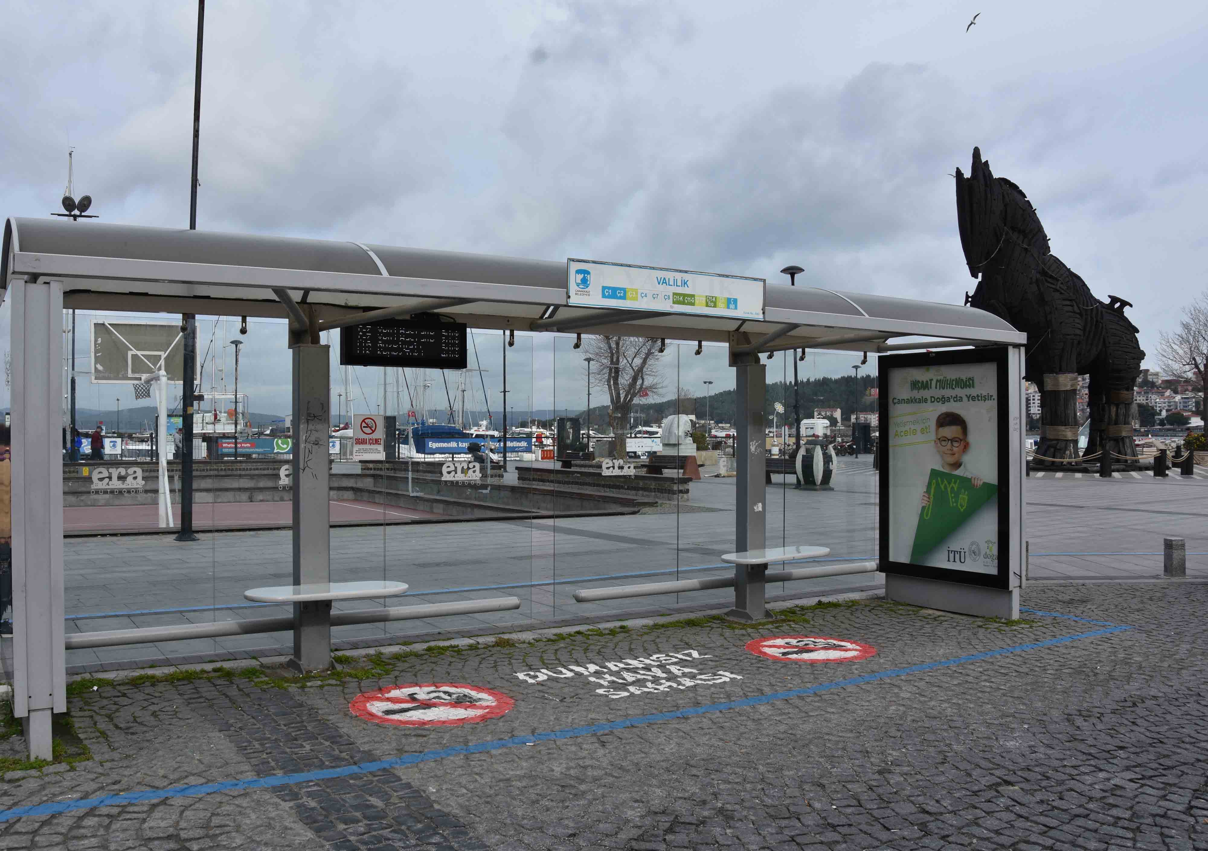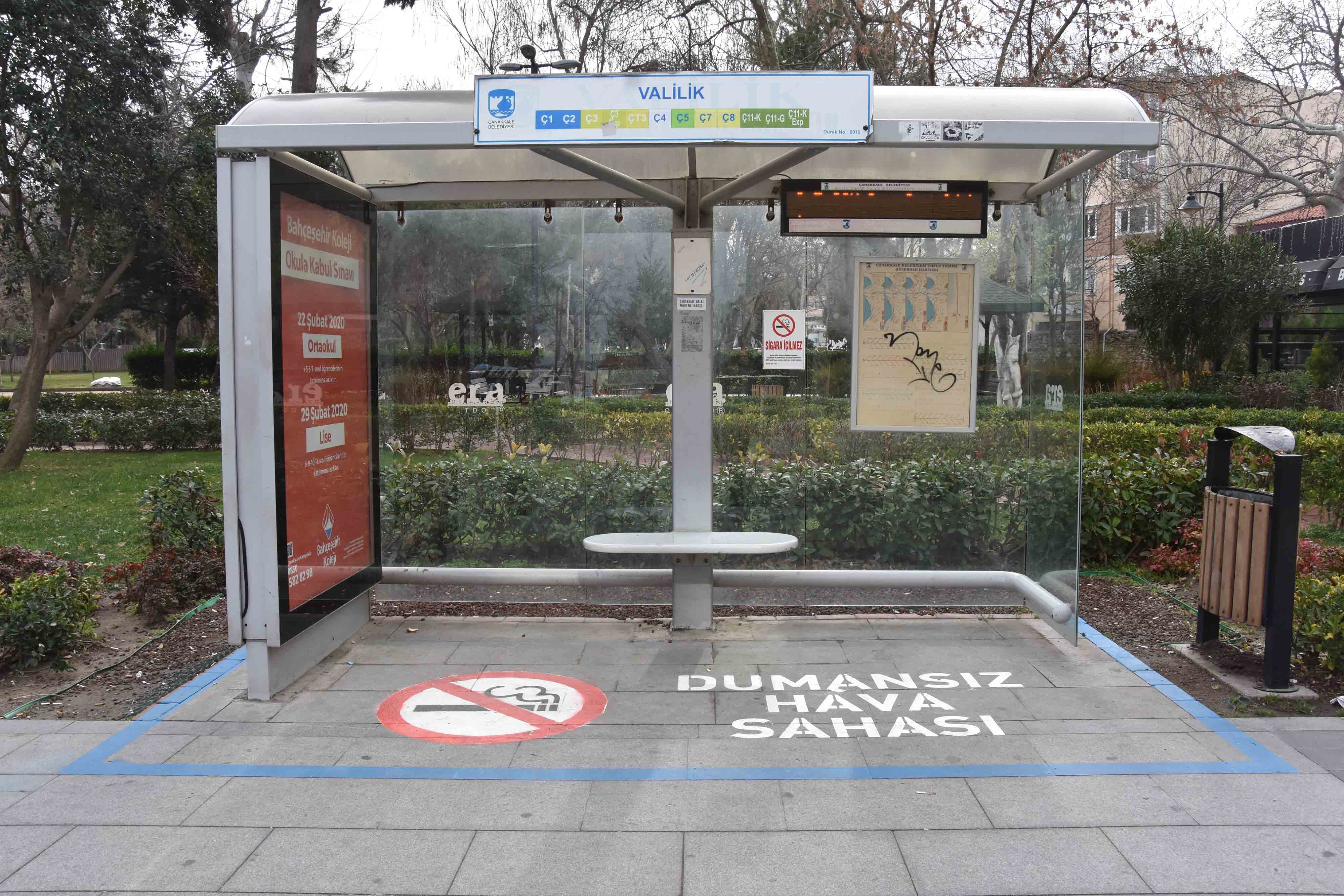 Çanakkale Belediyesi Ulaşım Hizmetleri Müdürlüğü tarafından, ülkemizde yürürlükte olan ve kapalı alanları kapsayan sigara içme yasağına daha fazla dikkat çekmek amacıyla otobüs duraklarında “Dumansız Hava Sahası” yazılı boyama çalışması gerçekleştirildi.