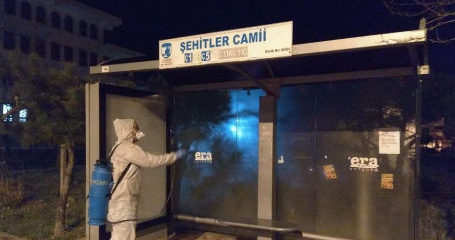 Toplu taşıma araçları ve Çanakkale Belediyesi hizmet binalarında gerçekleştirilen temizlik ve dezenfeksiyon çalışmalarının yanı sıra, otobüs durakları da toplu taşıma seferleri başlamadan önce 05.00-07.00 saatleri arasında salgın hastalıklara karşı önlem kapsamında ilaçlandı. Durakların ve toplu taşıma araçlarının dezenfekte çalışmaları rutin olarak sürdürülecek.