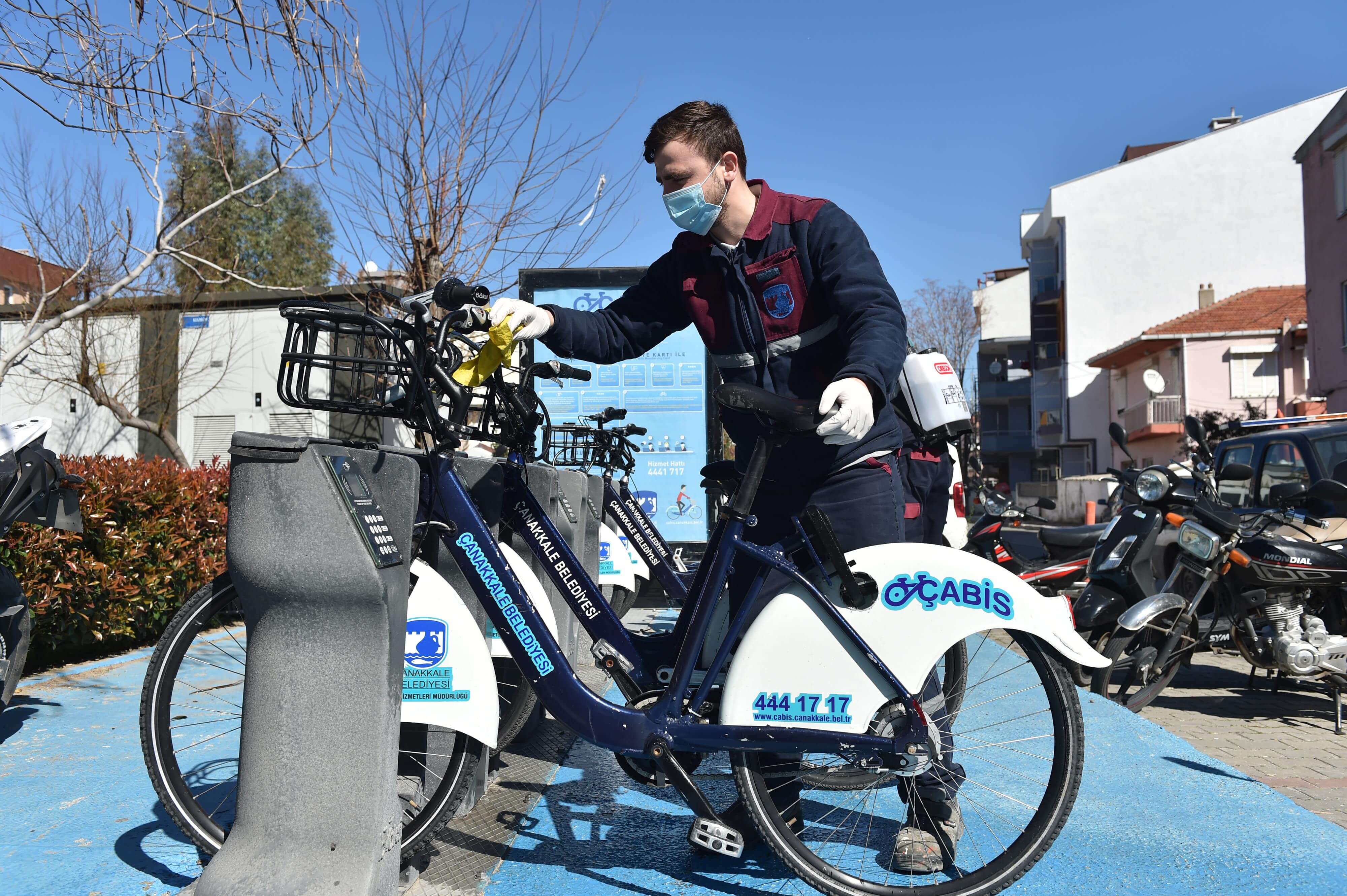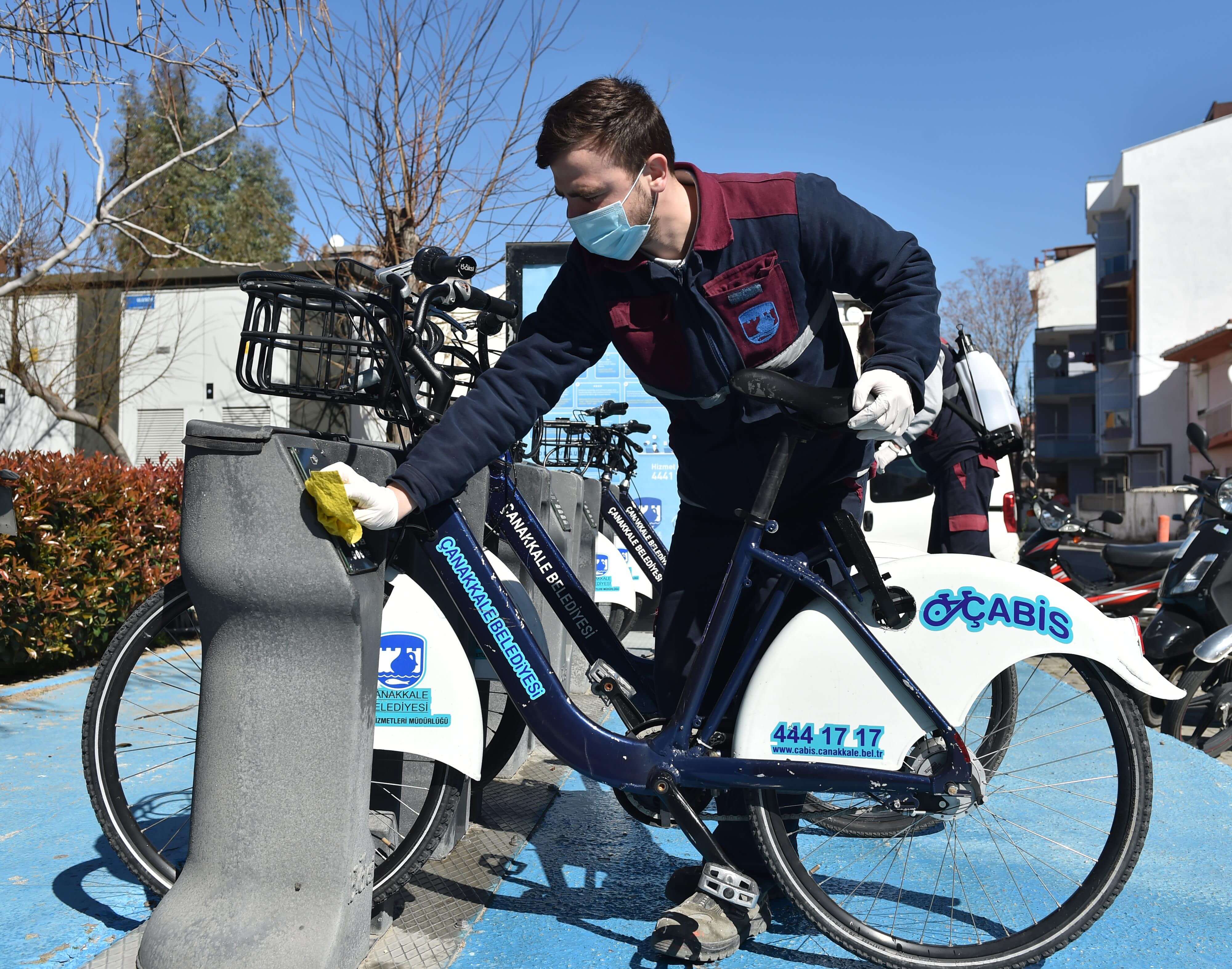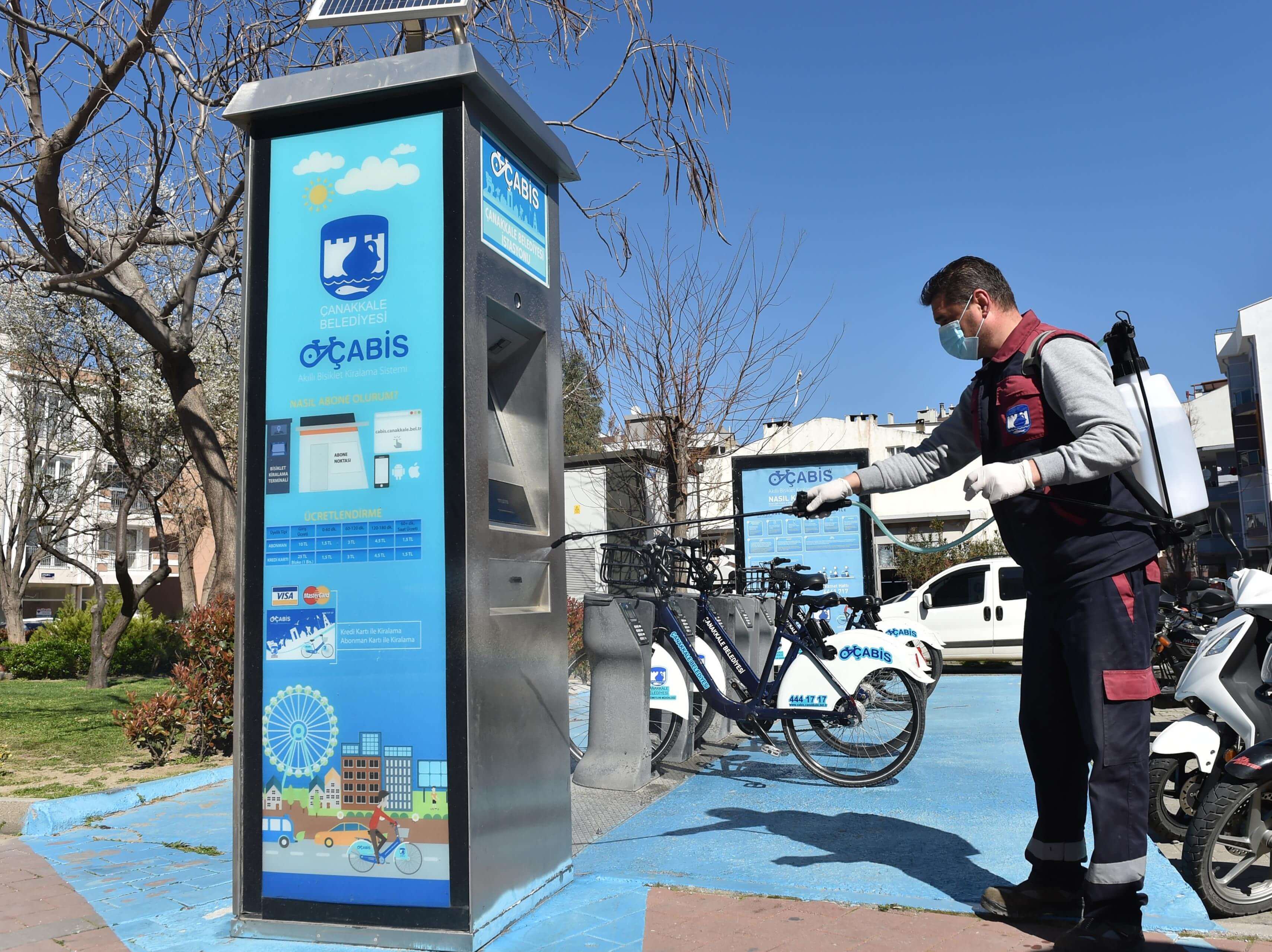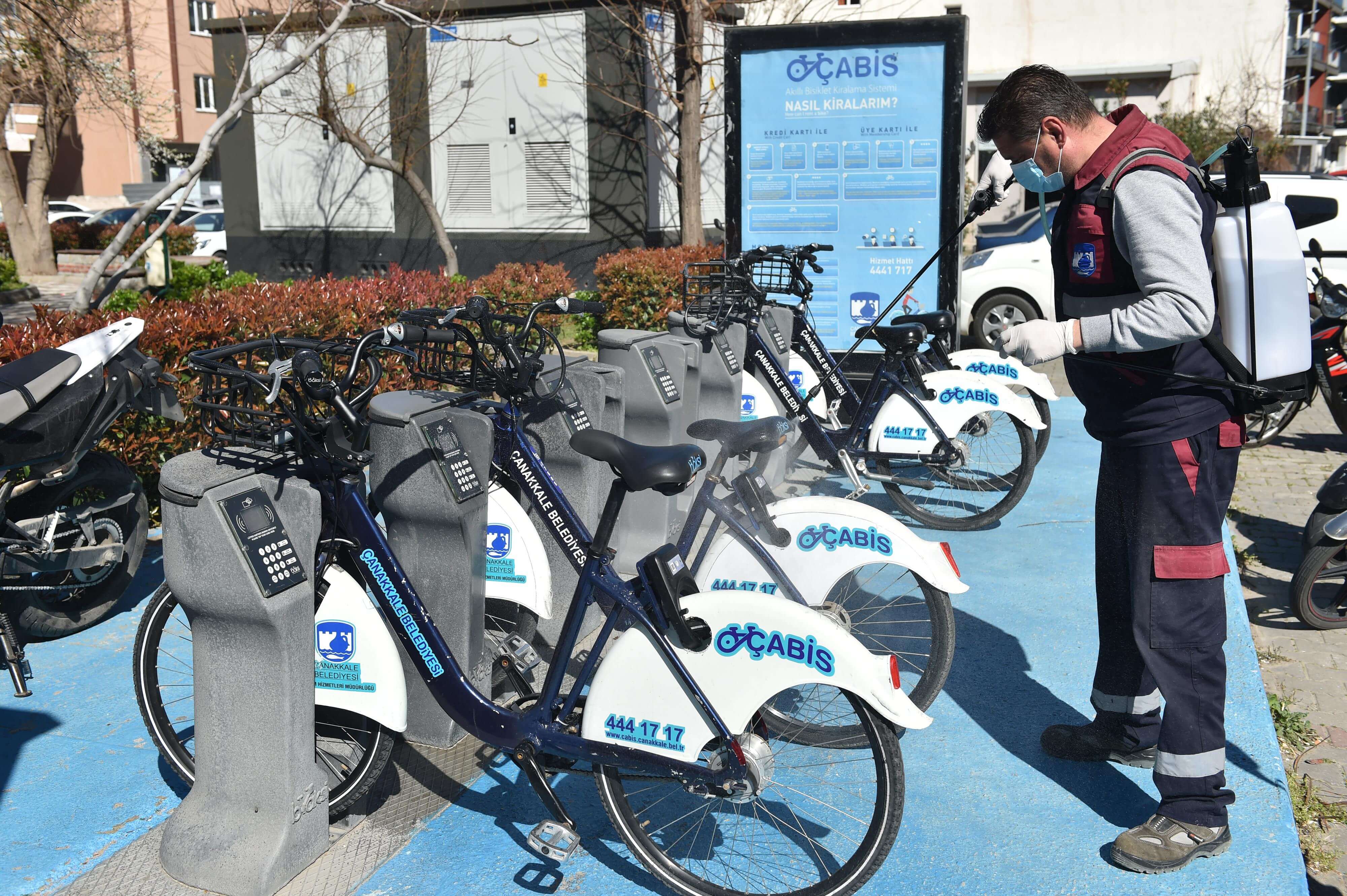 Çanakkale Belediyesinin salgın hastalık risklerine karşı almış olduğu önemler doğrultusunda, kentlilerin sıklıkla kullandığı ÇABİS bisikletleri de dezenfekte ediliyor.