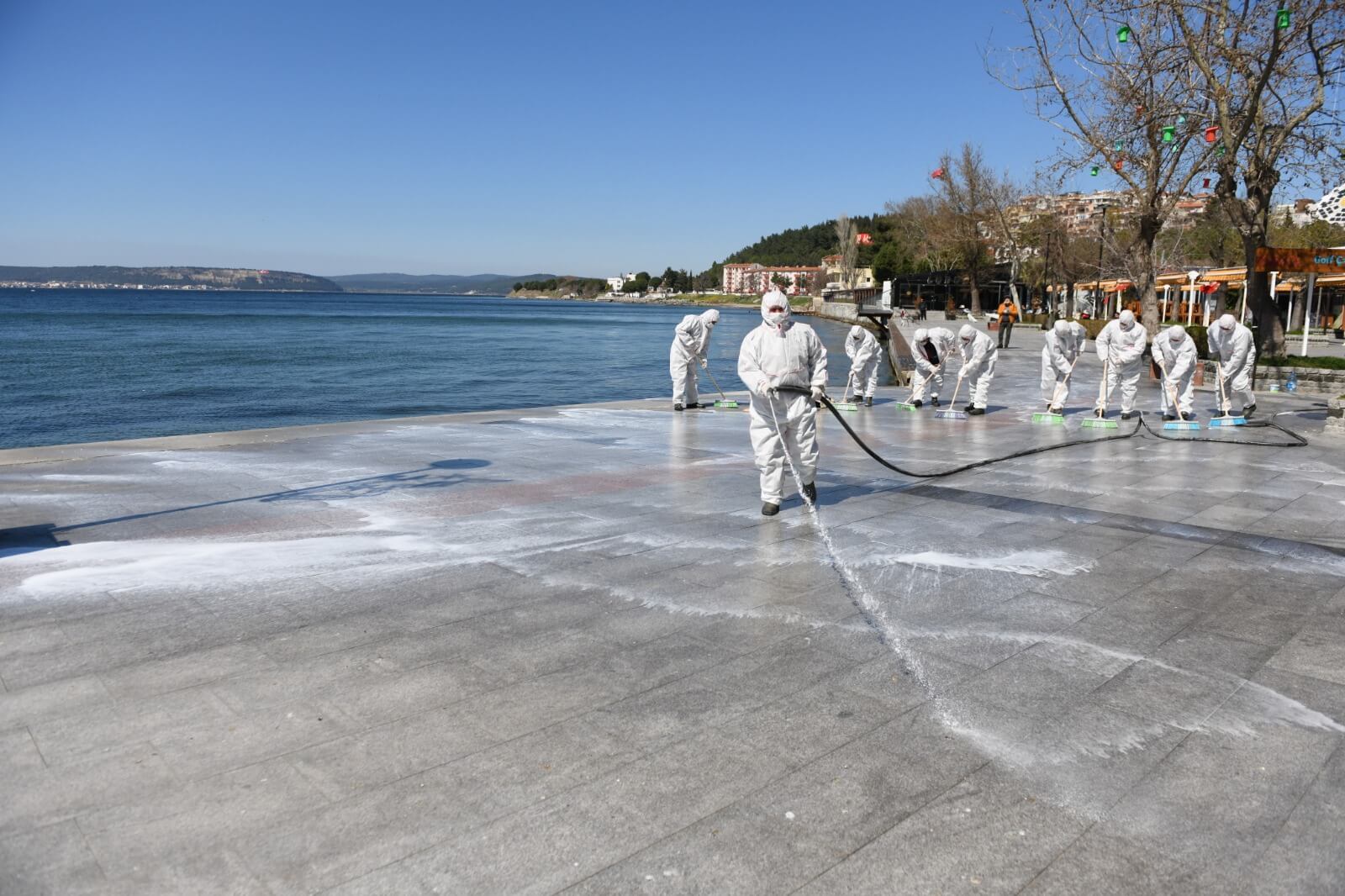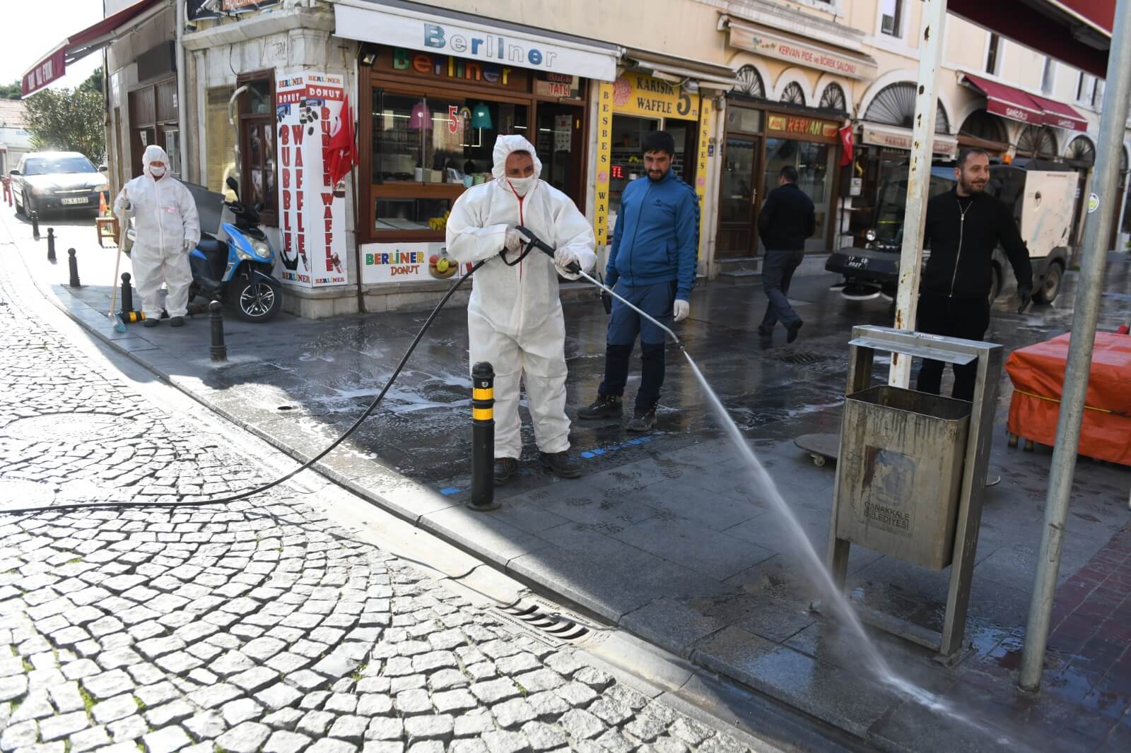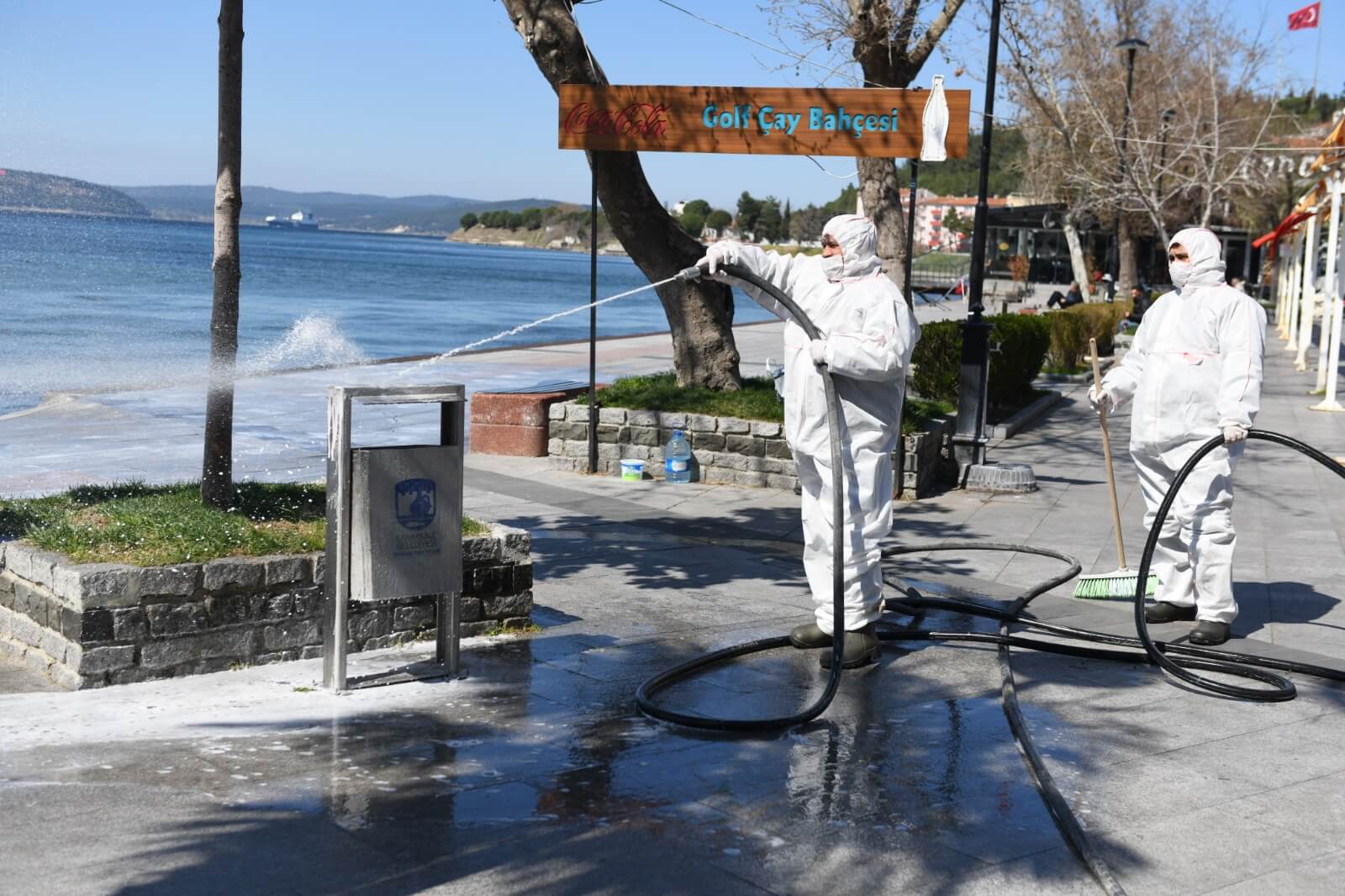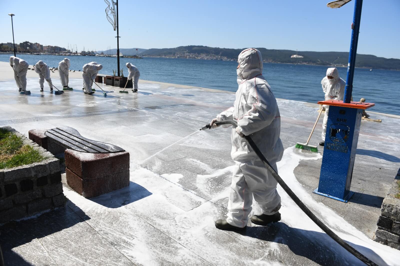 Çanakkale Belediyesi Temizlik İşleri ekiplerince gerçekleştirilen dezenfeksiyon çalışması kapsamında kordonboyu ve Çarşı Caddesi dezenfeksiyon sıvılar ile fırçalanarak temizlendi. Ekipler ayrıca çöp kovaları ve bankları da köpüklü su ile temizleyerek dezenfekte etti.