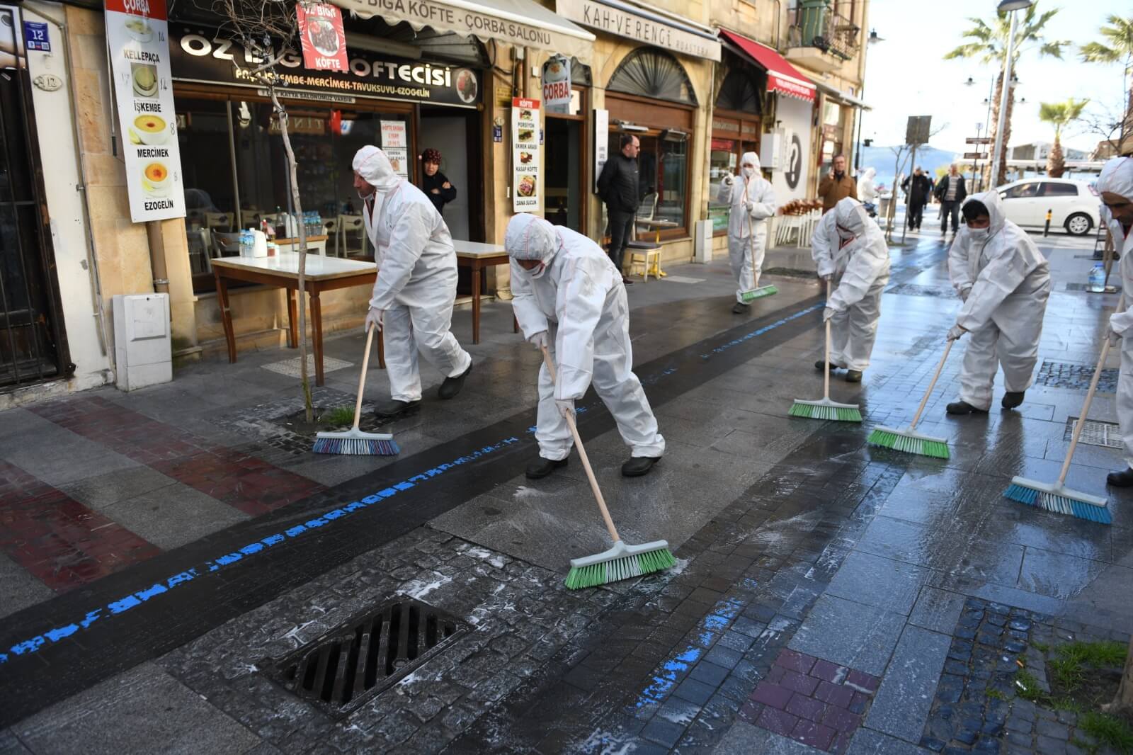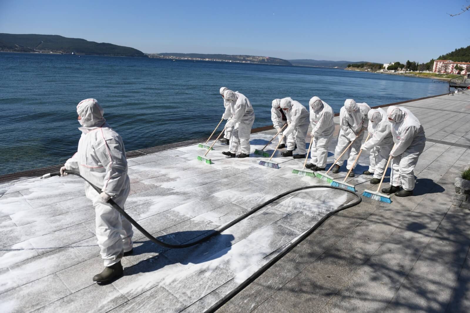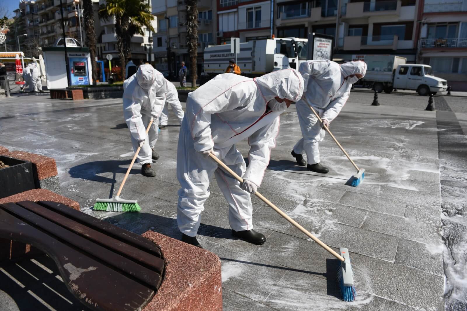 Çanakkale Belediyesi Temizlik İşleri ekiplerince gerçekleştirilen dezenfeksiyon çalışması kapsamında kordonboyu ve Çarşı Caddesi dezenfeksiyon sıvılar ile fırçalanarak temizlendi. Ekipler ayrıca çöp kovaları ve bankları da köpüklü su ile temizleyerek dezenfekte etti.