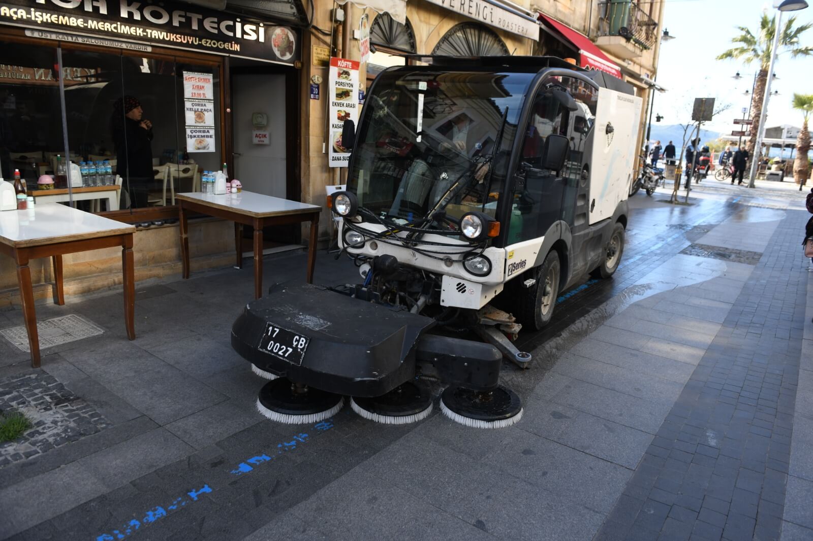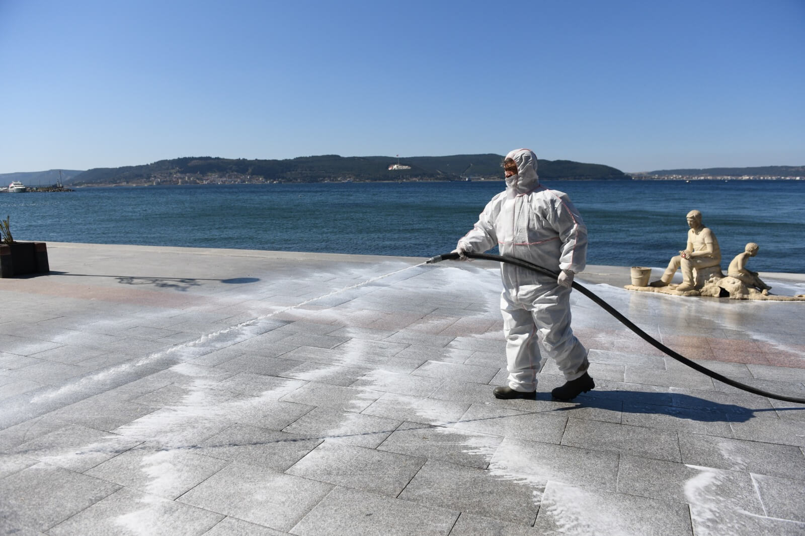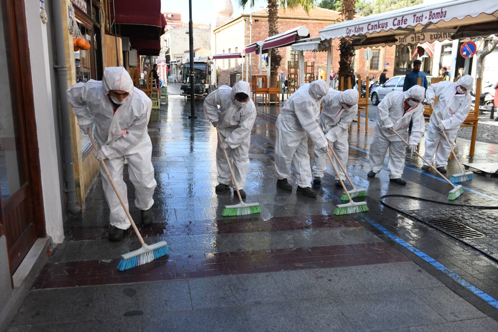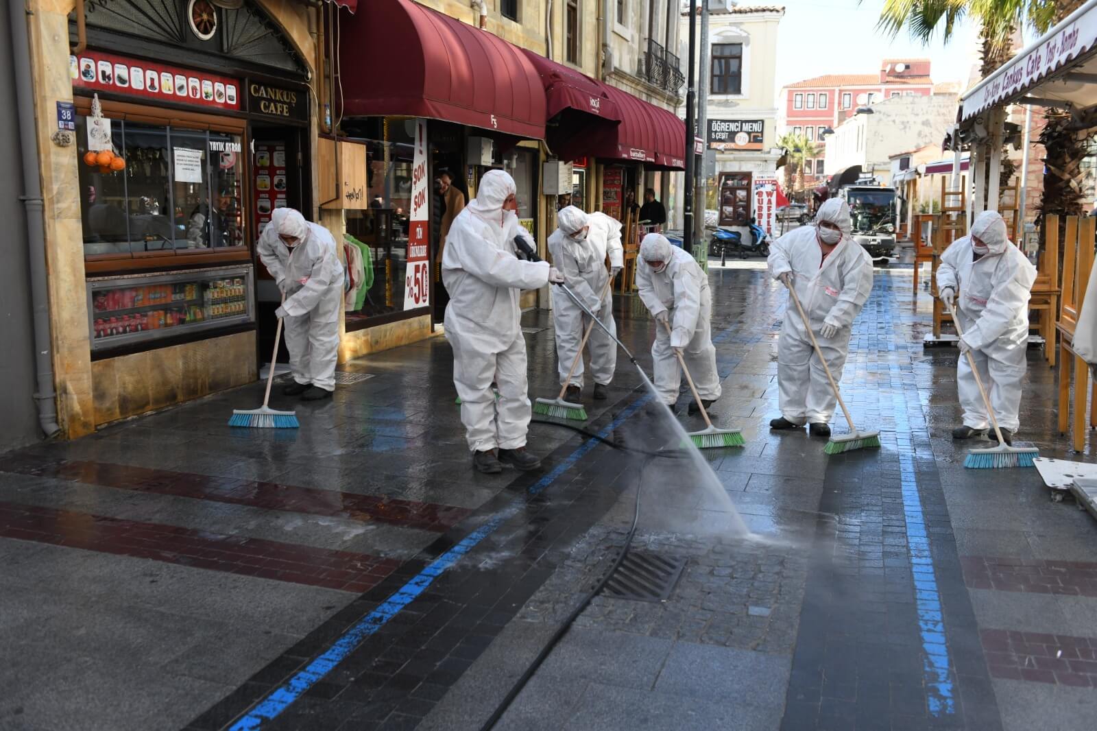 Çanakkale Belediyesi Temizlik İşleri ekiplerince gerçekleştirilen dezenfeksiyon çalışması kapsamında kordonboyu ve Çarşı Caddesi dezenfeksiyon sıvılar ile fırçalanarak temizlendi. Ekipler ayrıca çöp kovaları ve bankları da köpüklü su ile temizleyerek dezenfekte etti.