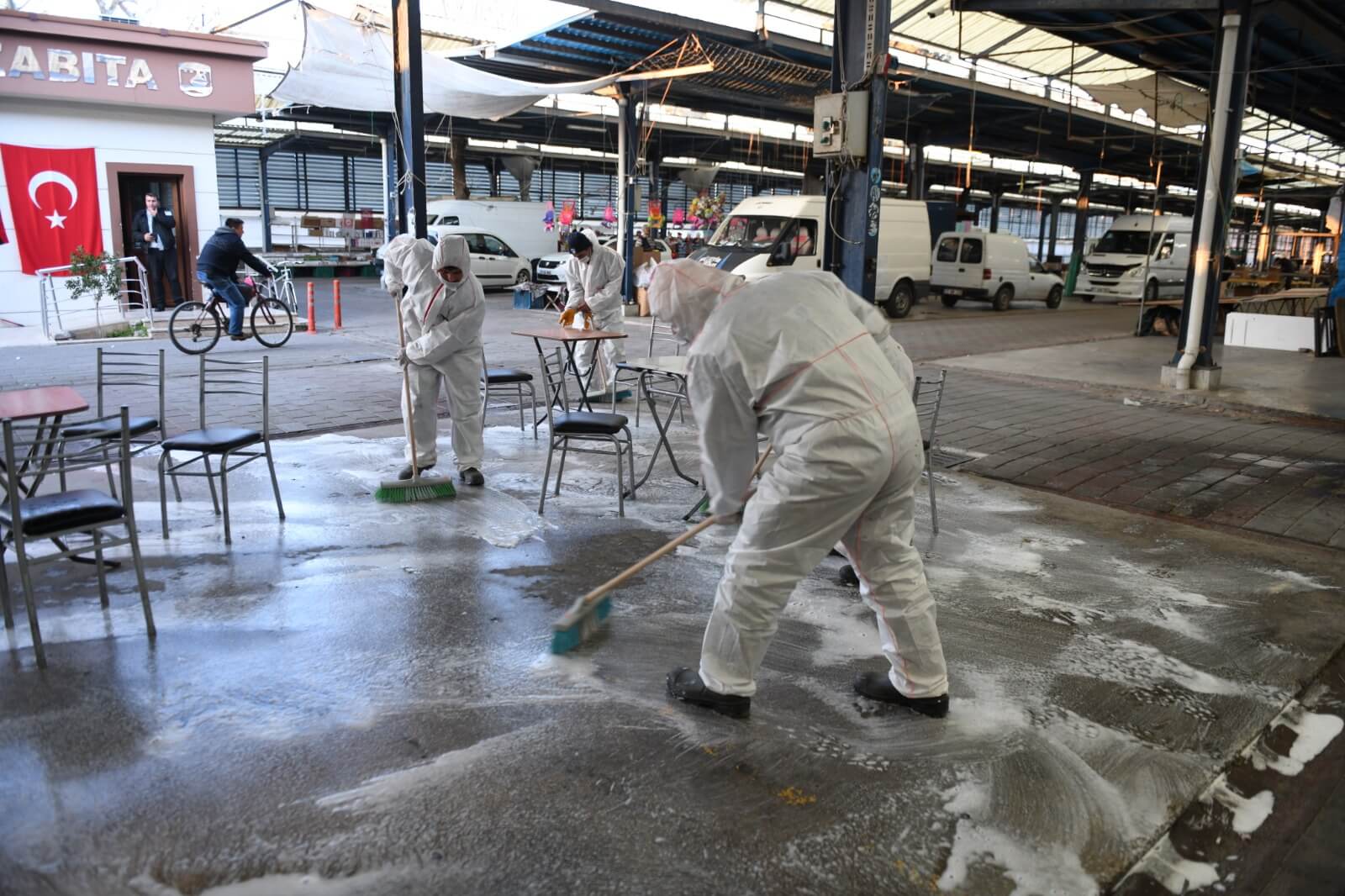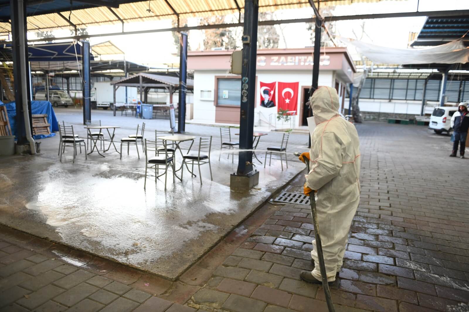 Kentlileri salgın hastalık riskine karşı korumak amacı ile gerçekleştirilen çalışmada Temizlik İşleri Müdürlüğü ekipleri, köpüklü dezanfektan sıvılar ve fırçalar ile Pazar alanını temizleyerek dezenfekte etti.