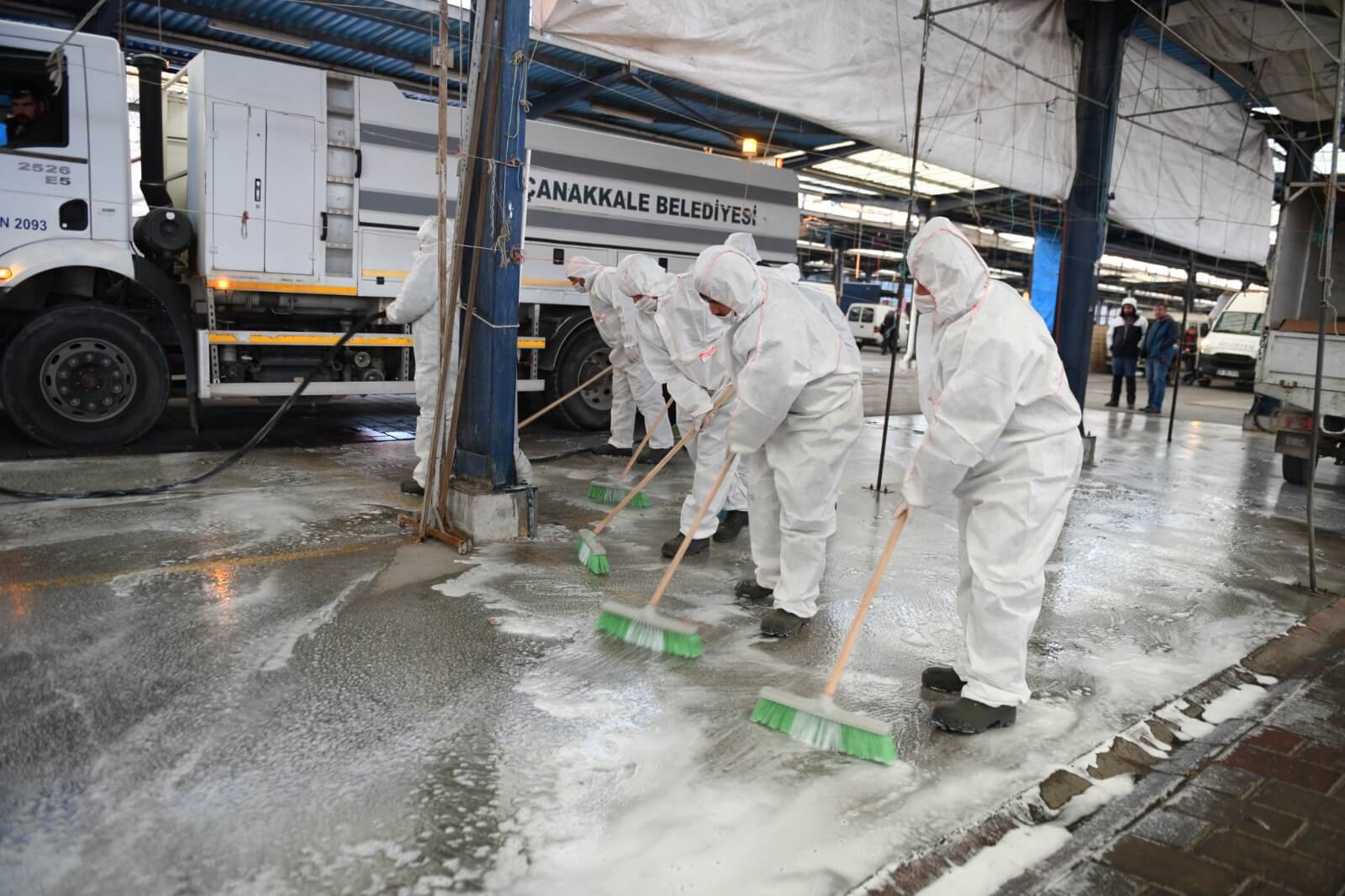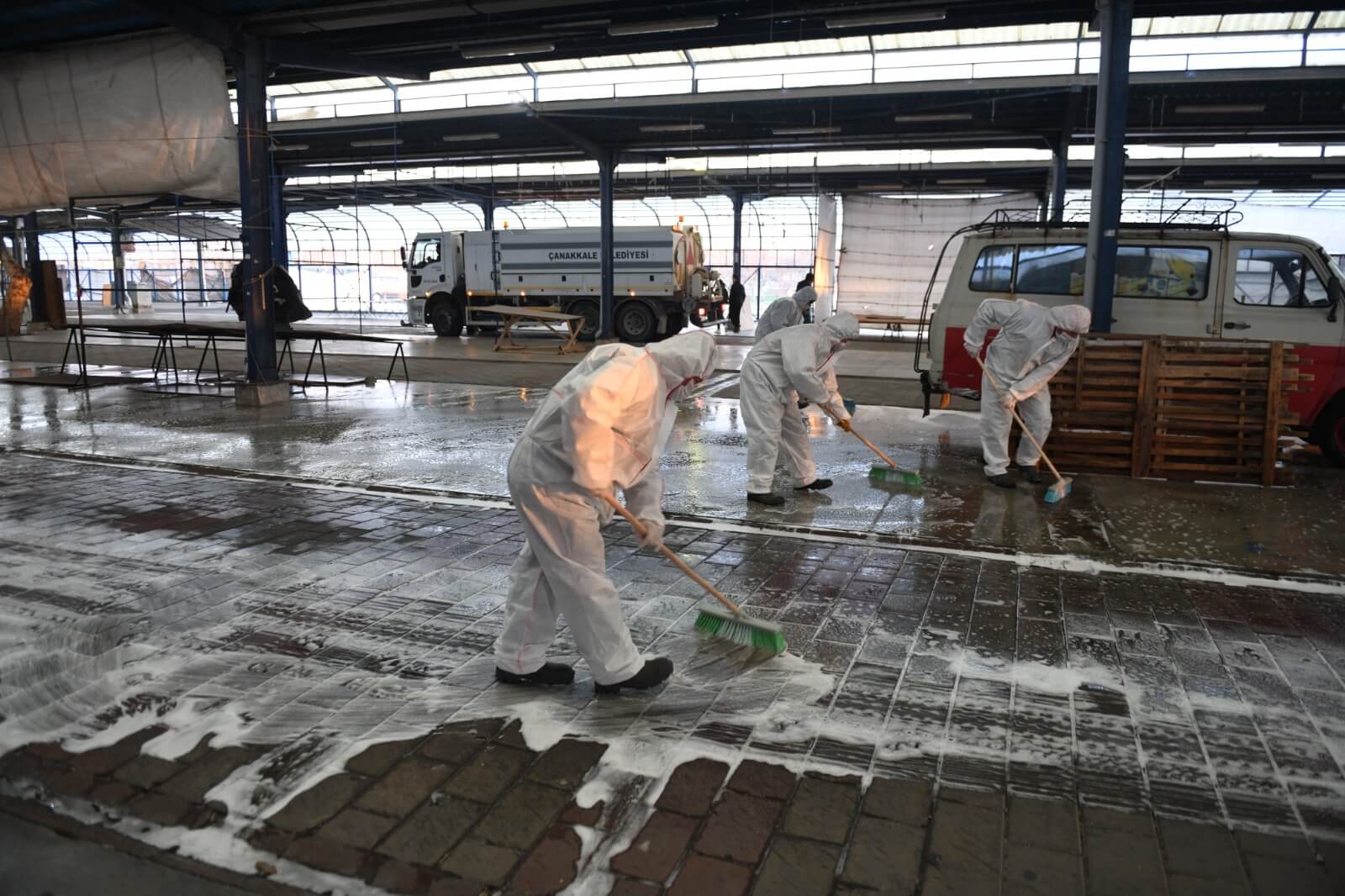 Salgın hastalık riskini önleme amacı ile çalışmalarını sürdüren Çanakkale Belediyesi, Cuma Pazarı öncesinde Pazar alanını dezenfekte etti.