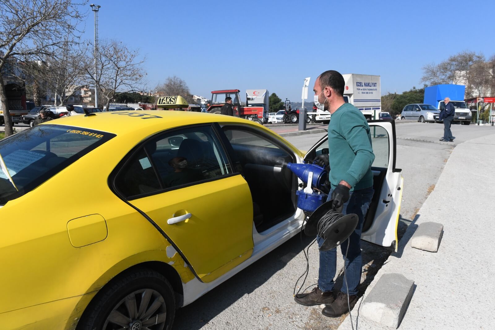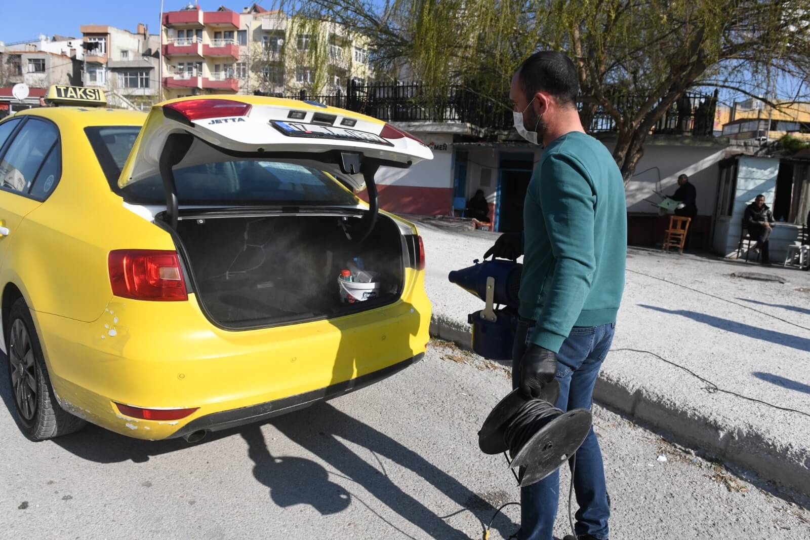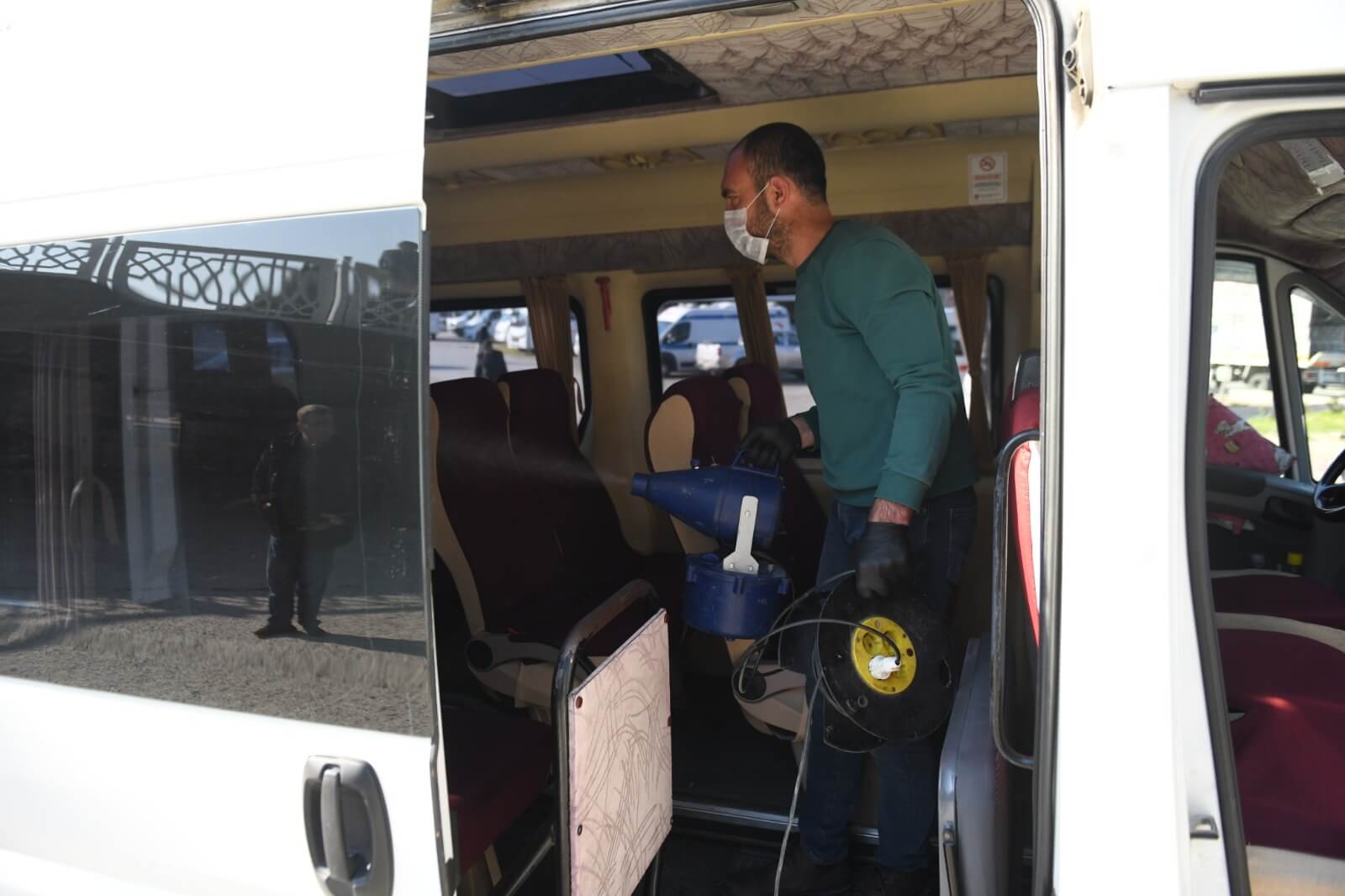 Kentlilerin yoğun olarak kullandığı alanlarda gerçekleştirilen dezenfeksiyon çalışmaları kapsamında Atatürk Köprüsü altında bulunan minibüs garajındaki köy minibüslerinin yanı sıra, kent içi ulaşımda yoğun olarak kullanılan taksiler de dezenfektan sıvılar ile dezenfekte edildi.
