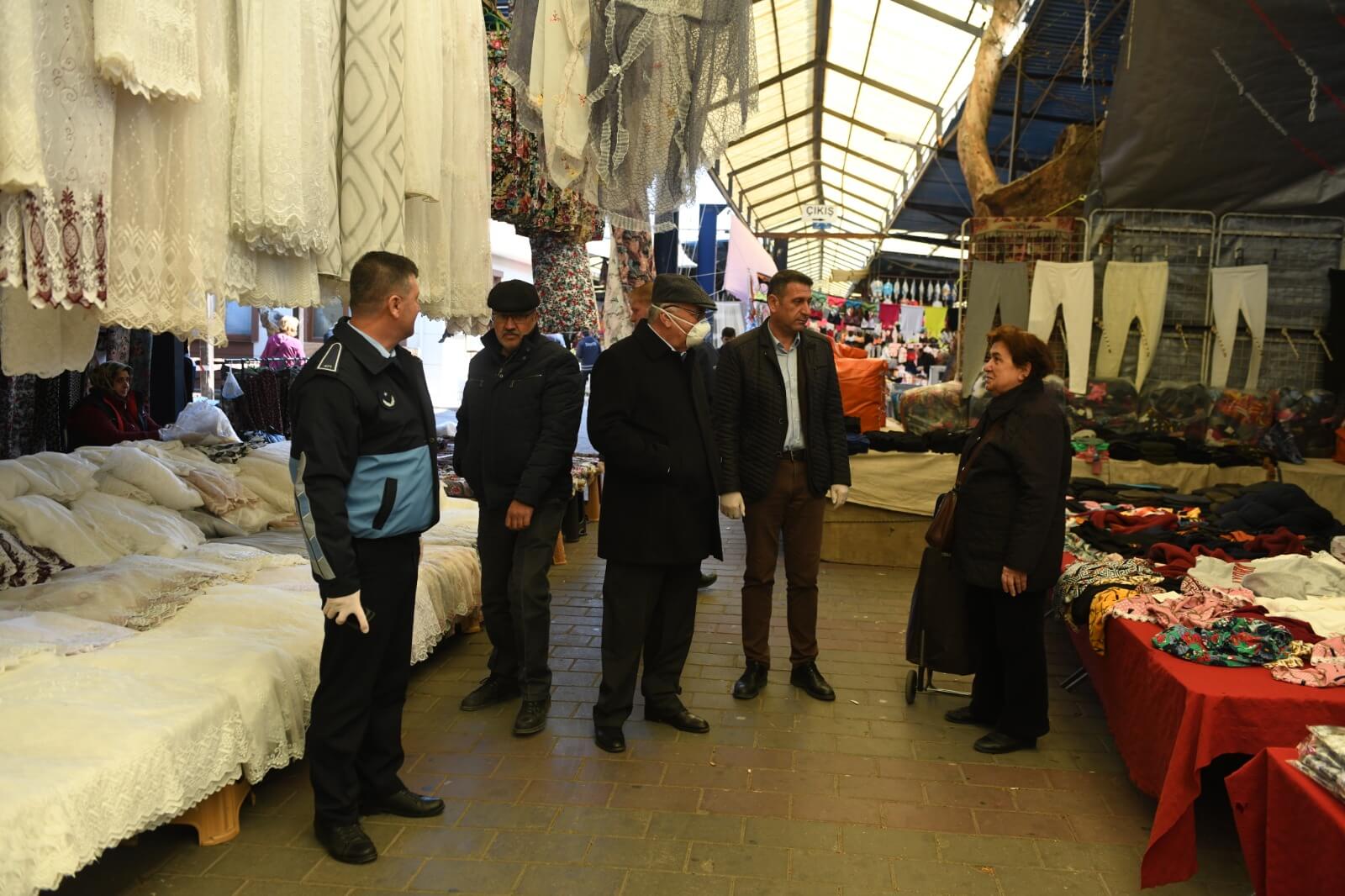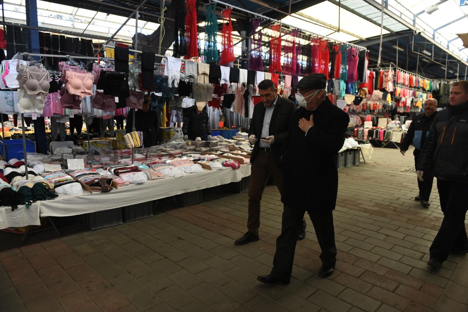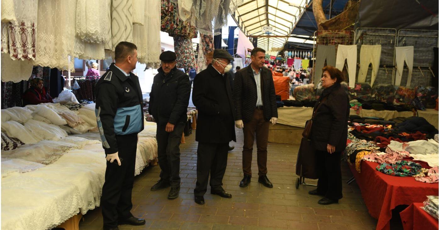 Belediye Başkanı Ülgür Gökhan, Cuma Pazarı’nda salgın hastalık riskine karşı alınan önlemlere ilişkin incelemelerde bulundu.