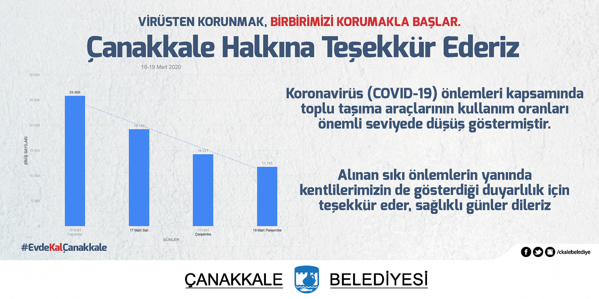 Koronavirüs (Covid-19) önlemleri kapsamında toplu taşıma araçlarının kullanım oranları önemli seviyede düşüş göstermiştir. Alınan sıkı önlemlerin yanında kentlilerimizin de gösterdiği duyarlılık için teşekkür eder, sağlıklı günler dileriz.