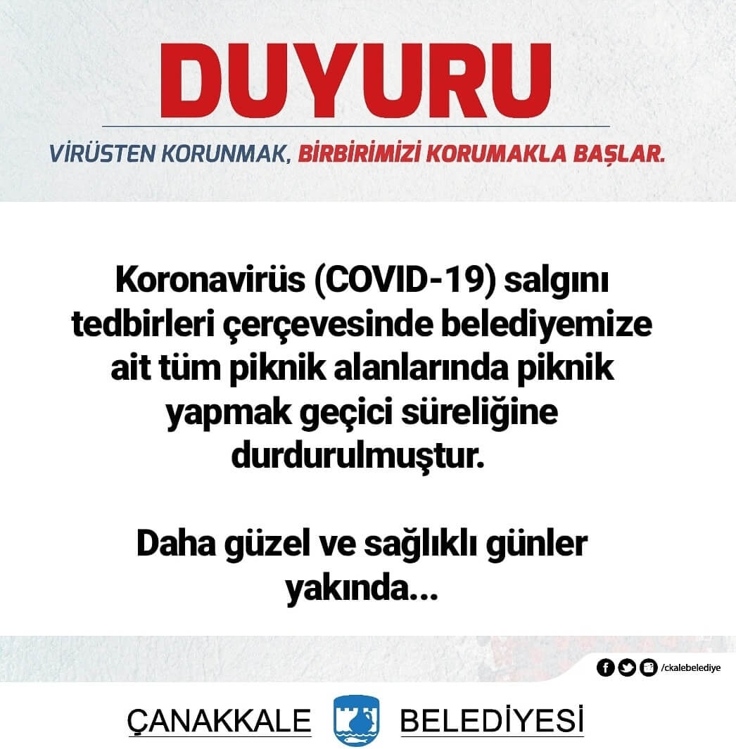 Koronavirüs (COVID-19) salgını tedbirleri çerçevesinde belediyemize ait tüm piknik alanlarında piknik yapmak geçici süreliğine durdurulmuştur. Daha güzel ve sağlıklı günler yakında...