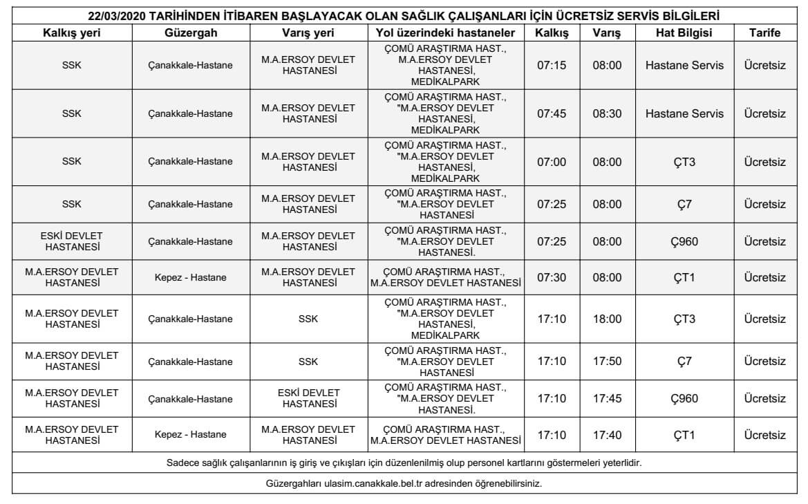 22 Mart 2020 tarihi itibariyle sağlık çalışanları için ücretsiz servis hizmeti başlatılmıştır. Görselde bilgileri verilen servisleri, tüm sağlık çalışanları personel kartlarıyla ücretsiz olarak kullanabilecektir.