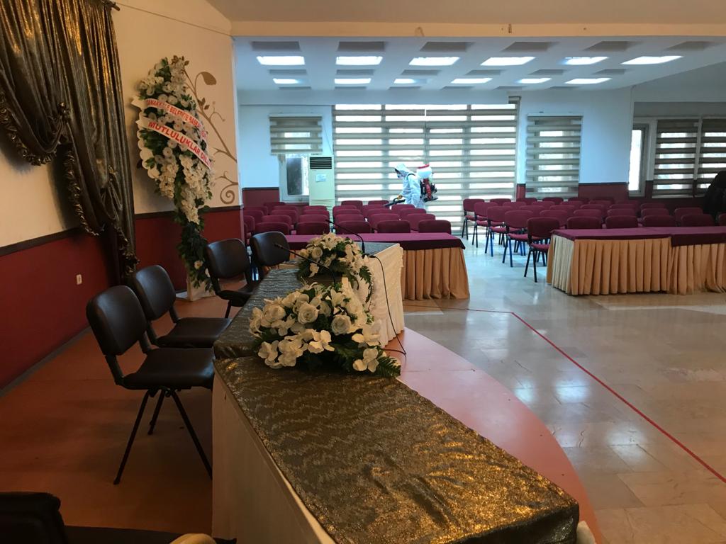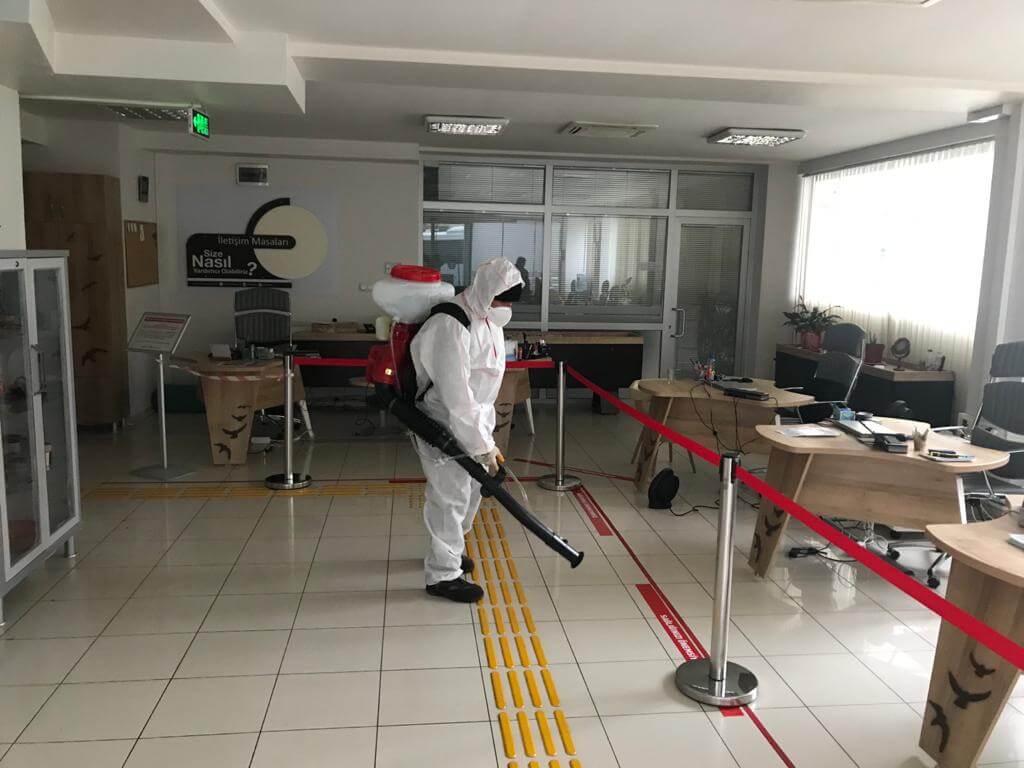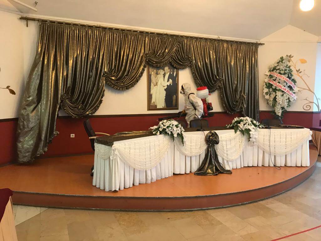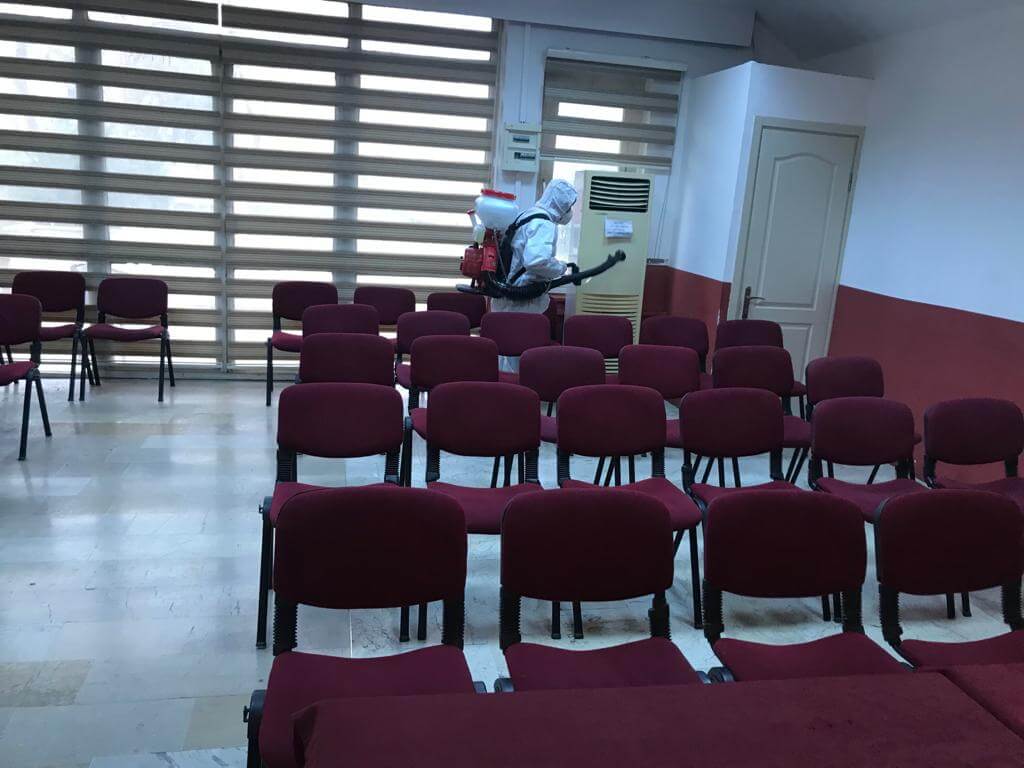 Gece gündüz kent genelinde aralıksız devam eden dezenfeksiyon çalışmalarının yanı sıra belediye binası ve Belediye Nikah Salonu da yüksek düzey ekolojik dezenfektan uygulaması yapılarak dezenfekte edildi.