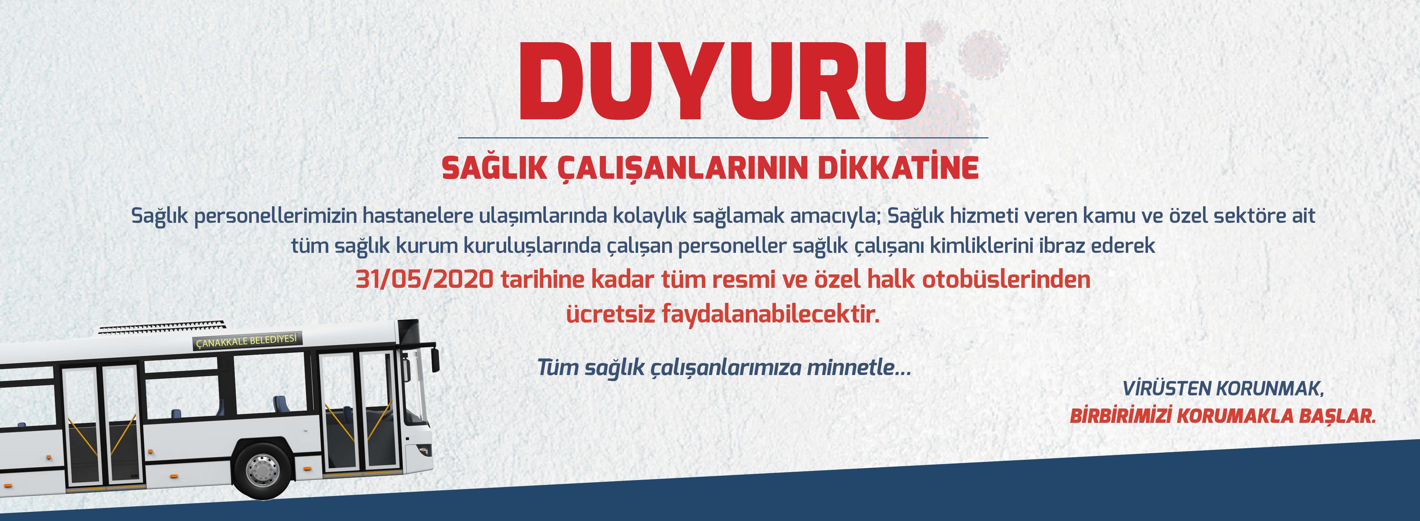 Sağlık personellerimizin hastanelere ulaşımlarında kolaylık sağlamak amacıyla; sağlık hizmeti veren kamu ve özel sektöre ait tüm sağlık kurum ve kuruluşlarında çalışan personeller, sağlık çalışanı kimliklerini ibraz ederek 31 Mayıs 2020 tarihine kadar tüm resmi ve özel halk otobüslerinden ücretsiz faydalanabilecektir.