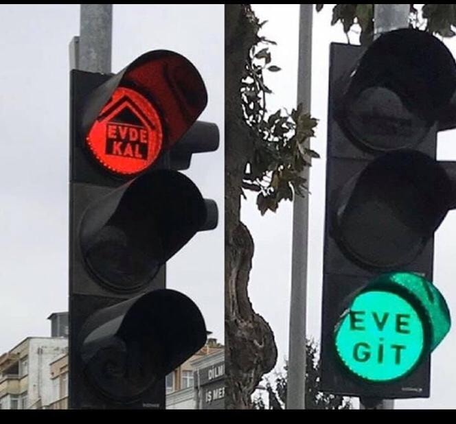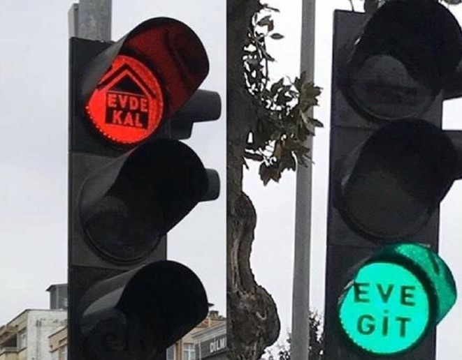 Bu kapsamda trafik lambalarında yer alan kırmızı ışıkta "Evde Kal", yeşil ışıkta ise "Eve Git" ibaresi yer alıyor.