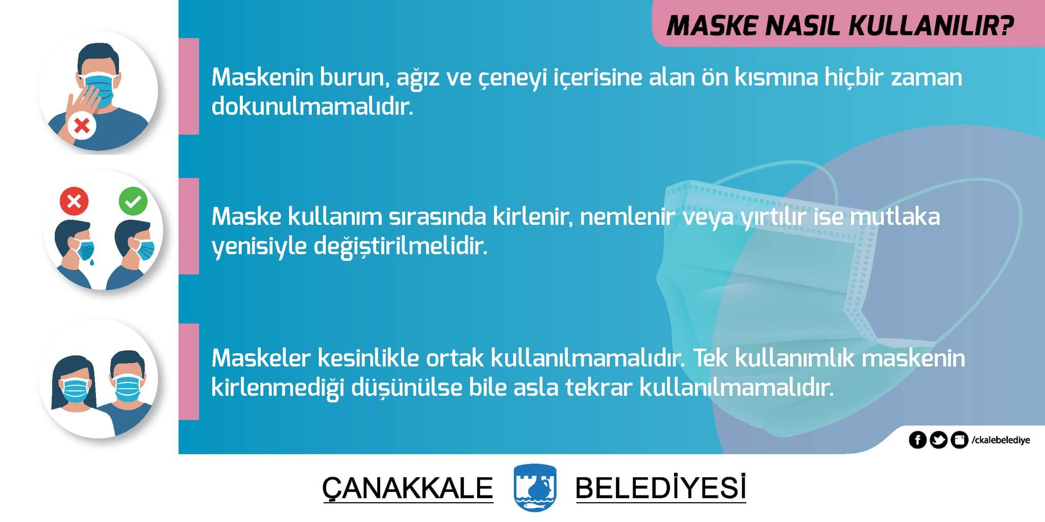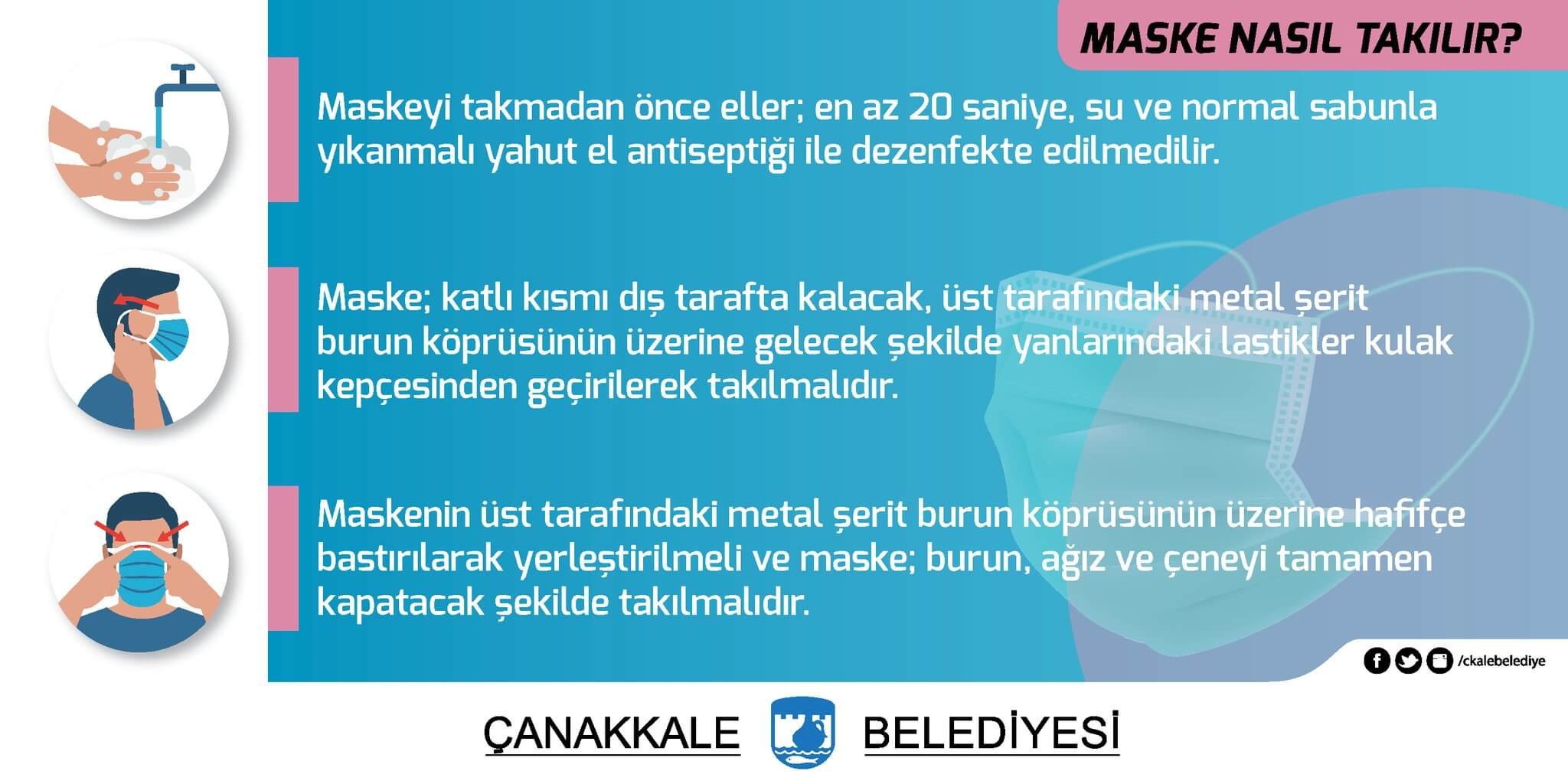 - Maskeyi takmadan önce eller; en az 20 saniye, su ve normal sabun ile yıkannalı yahut el antiseptiği ile dezenfekte edilmelidir.