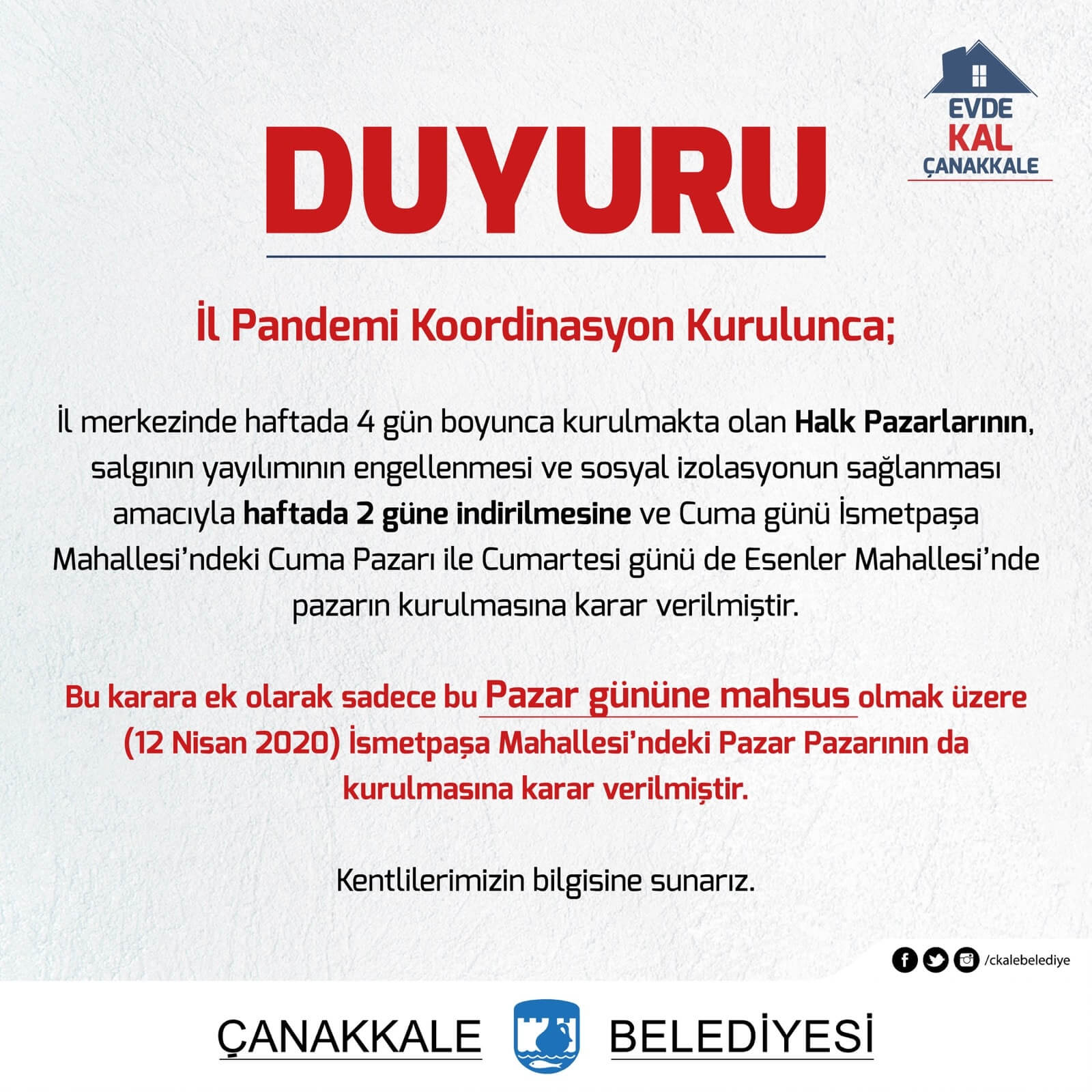 Bu karara ek olarak sadece bu Pazar gününe (12 Nisan 2020) mahsus olmak üzere İsmetpaşa Mahallesi'ndeki Pazar Pazarının da kurulmasına karar verilmiştir.
