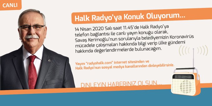 Belediye Başkanı Sayın Ülgür Gökhan, 14 Nisan 2020 Salı günü saat 11.45'te Halk Radyo'ya telefon bağlantısı ile canlı yayın konuğu olarak, Savaş Kerimoğlu'nun sorularıyla Çanakkale Belediyesinin Koranavirüs mücadele çalışmaları hakkında bilgi verip, ülke gündemi hakkında değerlendirmede bulunacaktır.