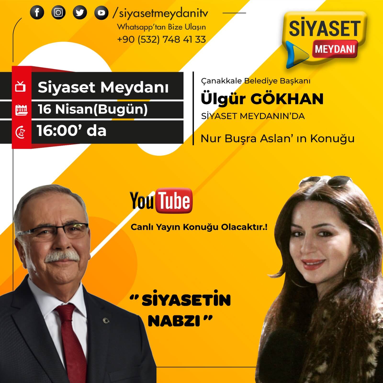 Belediye Başkanı Sayın Ülgür Gökhan, 16 Nisan 2020 Cuma günü (bugün) saat 16:00'da Siyaset Meydanı Tv' nin youtube kanalına canlı yayın konuğu olarak katılarak, Çanakkale Belesiyesinin Koronavirüs mücadelesini ve kent genelindeki çalışmalarını anlatacak.