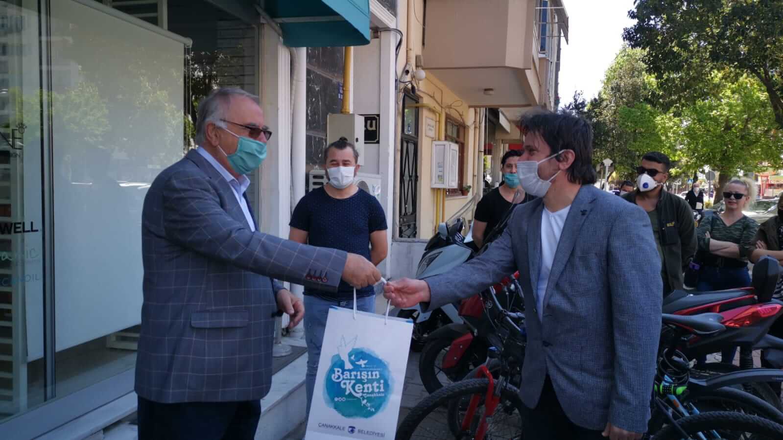 Çalışmaları yerinde inceleyen Belediye Başkanı Ülgür Gökhan da esnaflara dezenfektan, maske, eldiven ve siperlikten oluşan paket takdiminde bulundu.