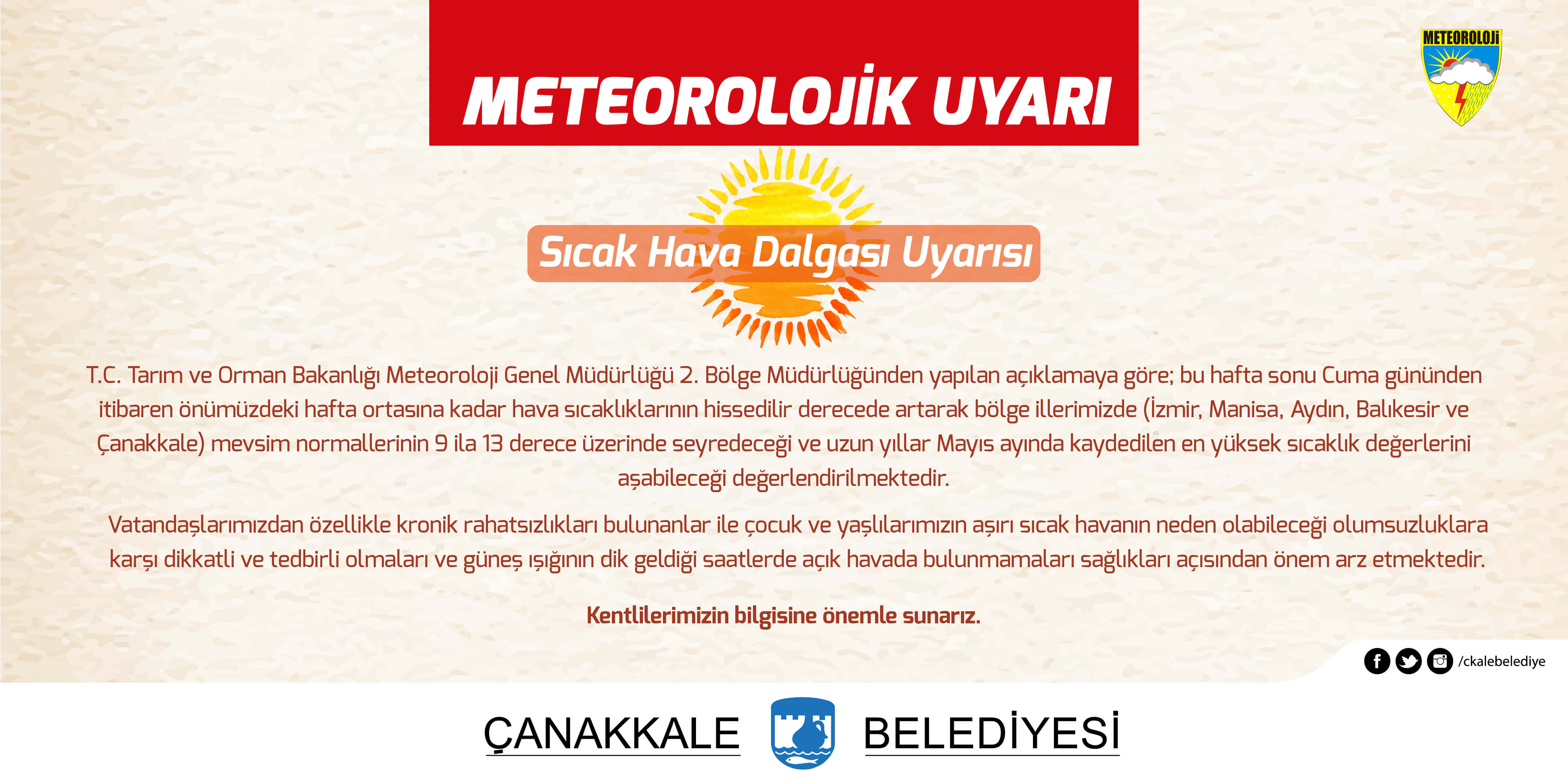 Vatandaşlarımızdan özellikle kronik rahatsızlıkları bulunanlar ile çocuk ve yaşlılarımızın aşırı sıcak havanın neden olabileceği olumsuzluklara karşı dikkatli ve tedbirli olmaları ve güneş ışığının dik geldiği saatlerde açık havada bulunmamaları sağlıkları açısından önem arz etmektedir.