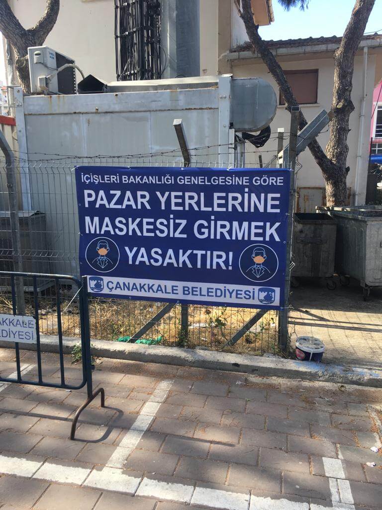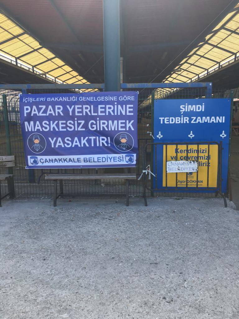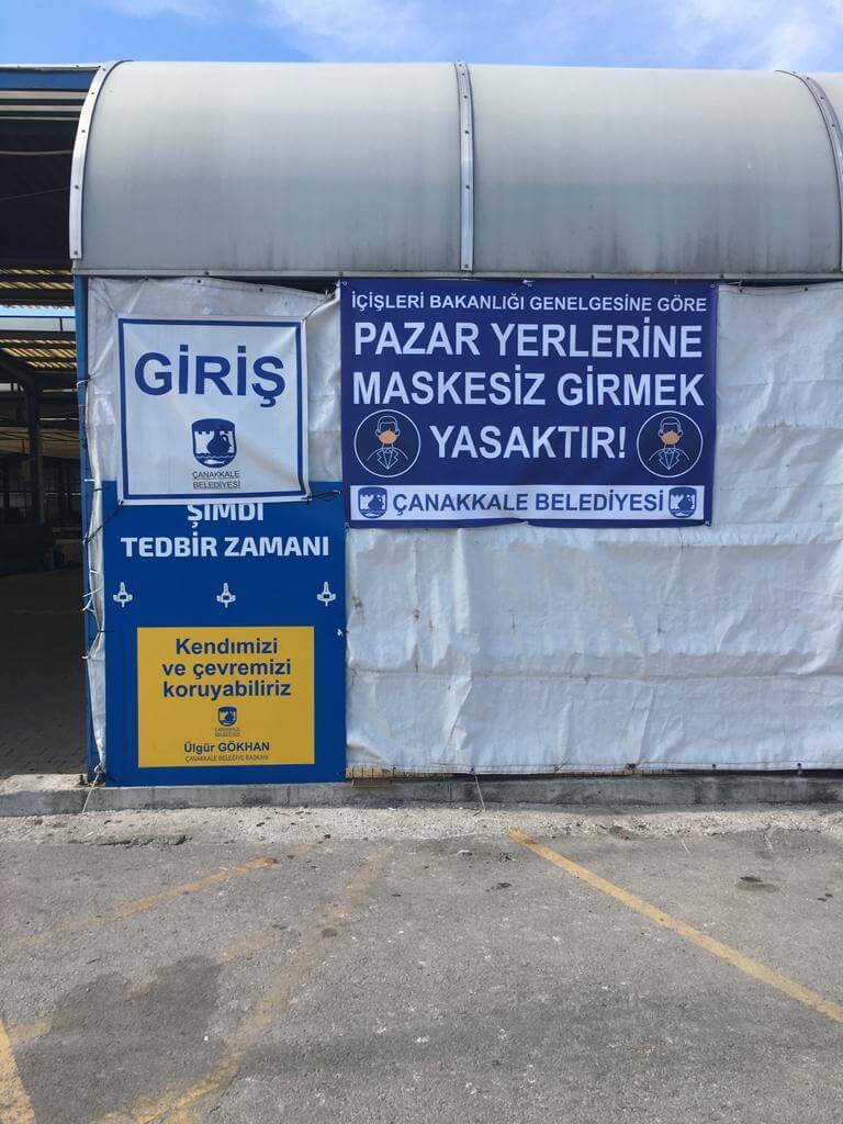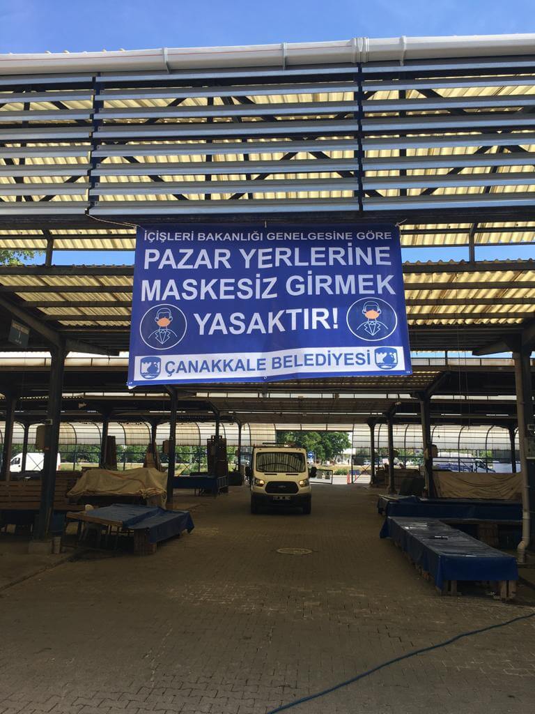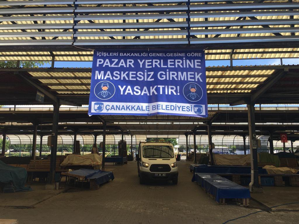 Koronavirüs salgını nedeni ile kent yaşamının ve kentlilerin olumsuz etkilenmemesi amacı ile çalışmalarını sürdüren Çanakkale Belediyesi ekipleri, Cuma Pazarı öncesi kentlilerin sağlığını korumak amacı ile alınan tedbirlerin yanı sıra pazar alanı girişlerine de, “Pazar Yerlerine Maskesiz Girmek Yasaktır” yazılı uyarı yazılarını astı.