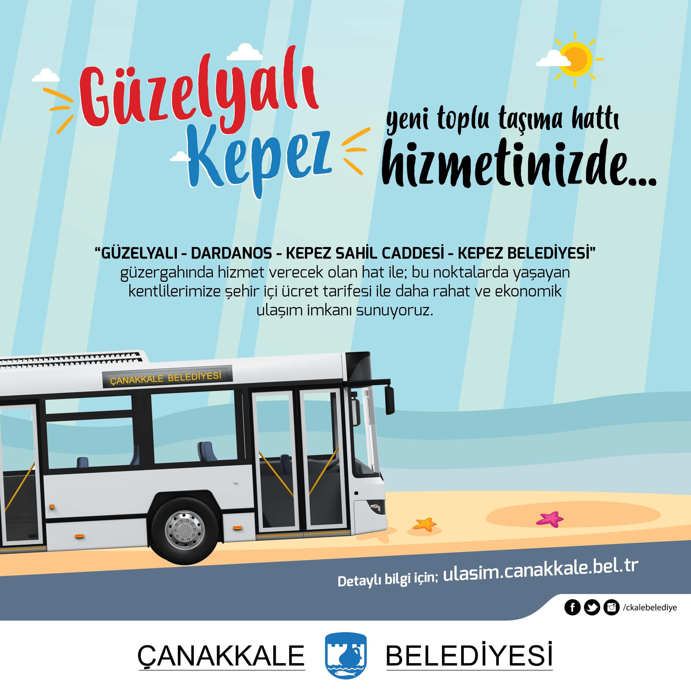 Güzelyalı-Dardanos-Kepez Sahil Caddesi-Kepez Belediyesi güzergahında hizmet vermeye başlayan yeni hat kentlilerimize, şehir içi ücret tarifesi ile daha rahat ve ekonomik ulaşım imkanı sağlıyor.