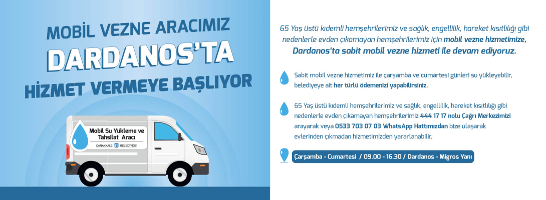 Mobil Vezne Aracımız, Çarşamba ve Cumartesi günleri 09.00-16.30 saatleri arasında Dardanos Migros yanında hizmet verecektir.
