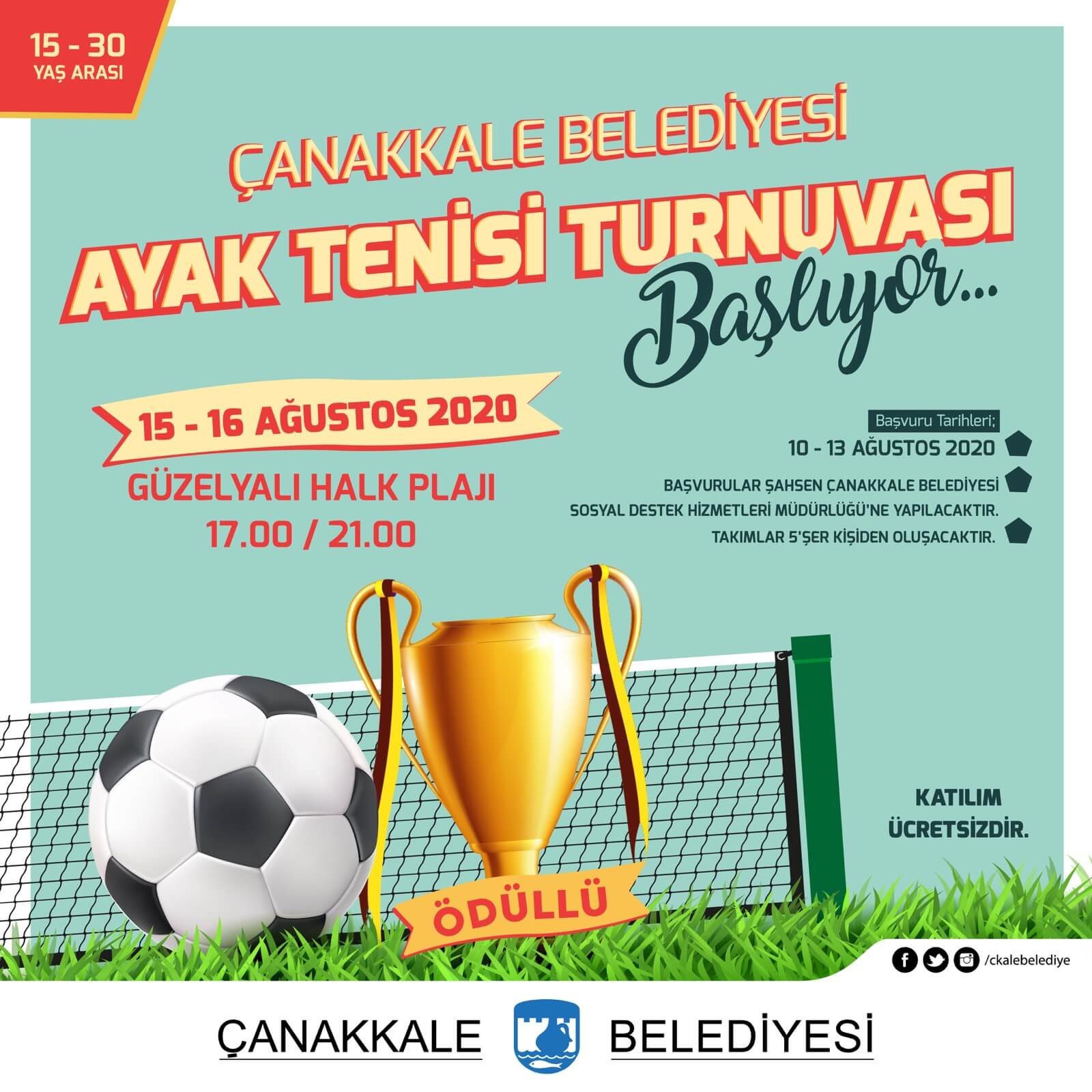 Çanakkale Belediyesi tarafından düzenlenen ödüllü Ayak Tenisi Turnuvası, 15-16 Ağustos 2020 tarihleri arasında Güzelyalı Halk Plajı’nda gerçekleşecek.