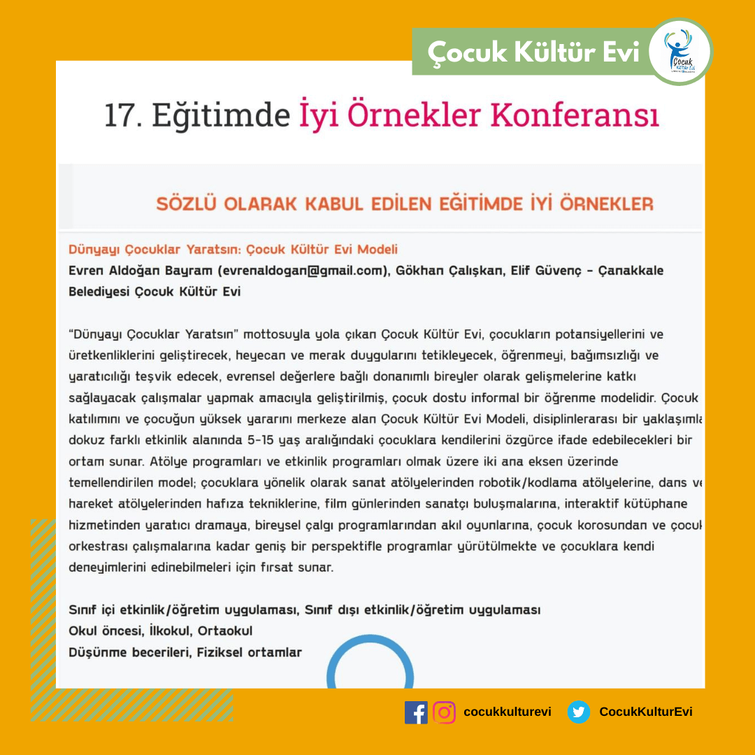 Bu yıl 17.'si düzenlenen ve koronavirüs salgını karşısında alınan önlemler nedeniyle dijital ortamda gerçekleşen konferansa “Dünyayı Çocuklar Yaratsın: Çocuk Kültür Evi Modeli” çalışmasıyla başvuran Çocuk Kültür Evi, eğitimde “iyi örnek” olarak seçildi. Türkiye'nin pek çok yerinden eğitimcilerin ve eğitim hizmeti veren kurumların başvurduğu konferansta, eğitim felsefesinden alan kurgusuna, atölye programlarından etkinliklerine kadar yürüttüğü çalışmaları sunan Kültür Evi'nin dosyası Eğitim Reformu Girişimi tarafından hazırlanan kitapçıkla eğitimcilere ve ilgili kurumlara referans olmak üzere erişime açıldı.