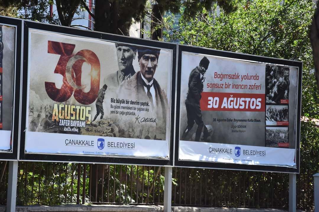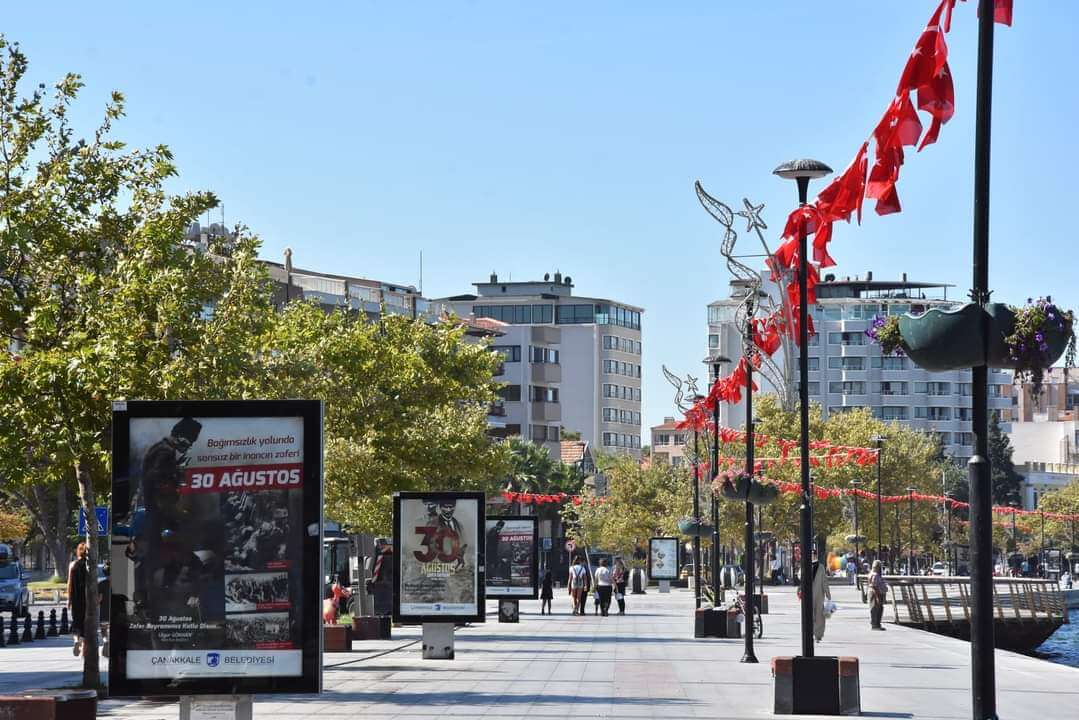 Coşkuyla kutlamaya hazırlandığımız 30 Ağustos Zafer Bayramı için Demircioğlu Caddesi boydan boya olmak üzere kentin pek çok noktası Türk Bayrakları ve Atatürk posterleriyle donatılırken, kentin çeşitli noktalarında da Çanakkale Belediyesi’nin kutlama mesajları yer aldı.