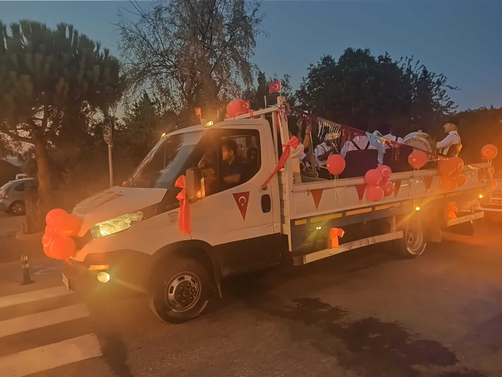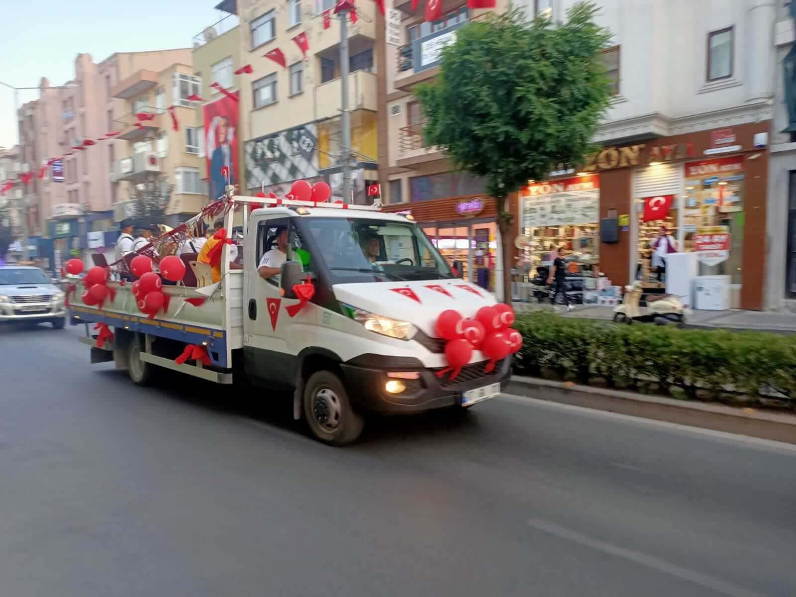 Şarkılar ve marşlar ile cadde ve sokaklarda gezen Troya Balkan Orkestrası'na kentliler de pencere ve balkonlardan bayrak ve Atatürk Posterleri ile eşlik etti.