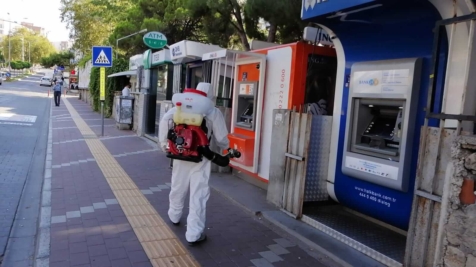Çanakkale Belediyesi ekipleri, salgın hastalık riskine karşı gerçekleştirilen çalışmalar doğrultusunda ayrıca kentliler tarafından yoğun olarak kullanılan bankamatikleri de rutin olarak dezenfekte etmeye devam ediyor.