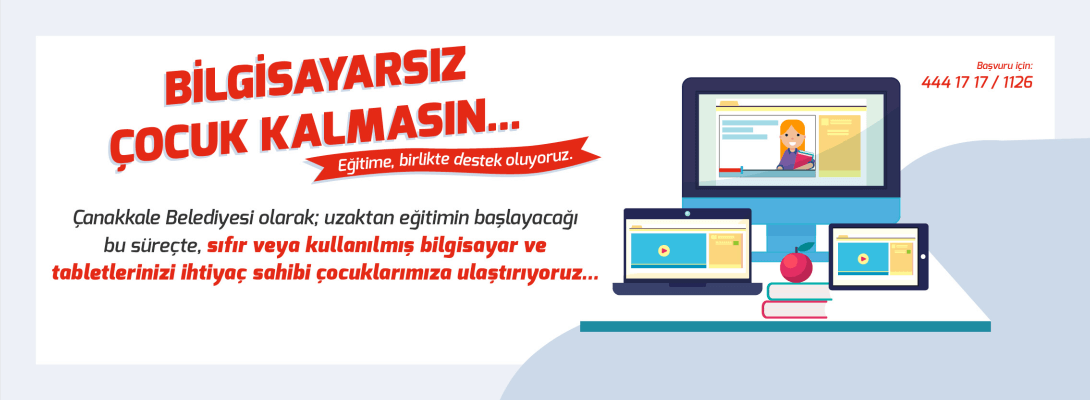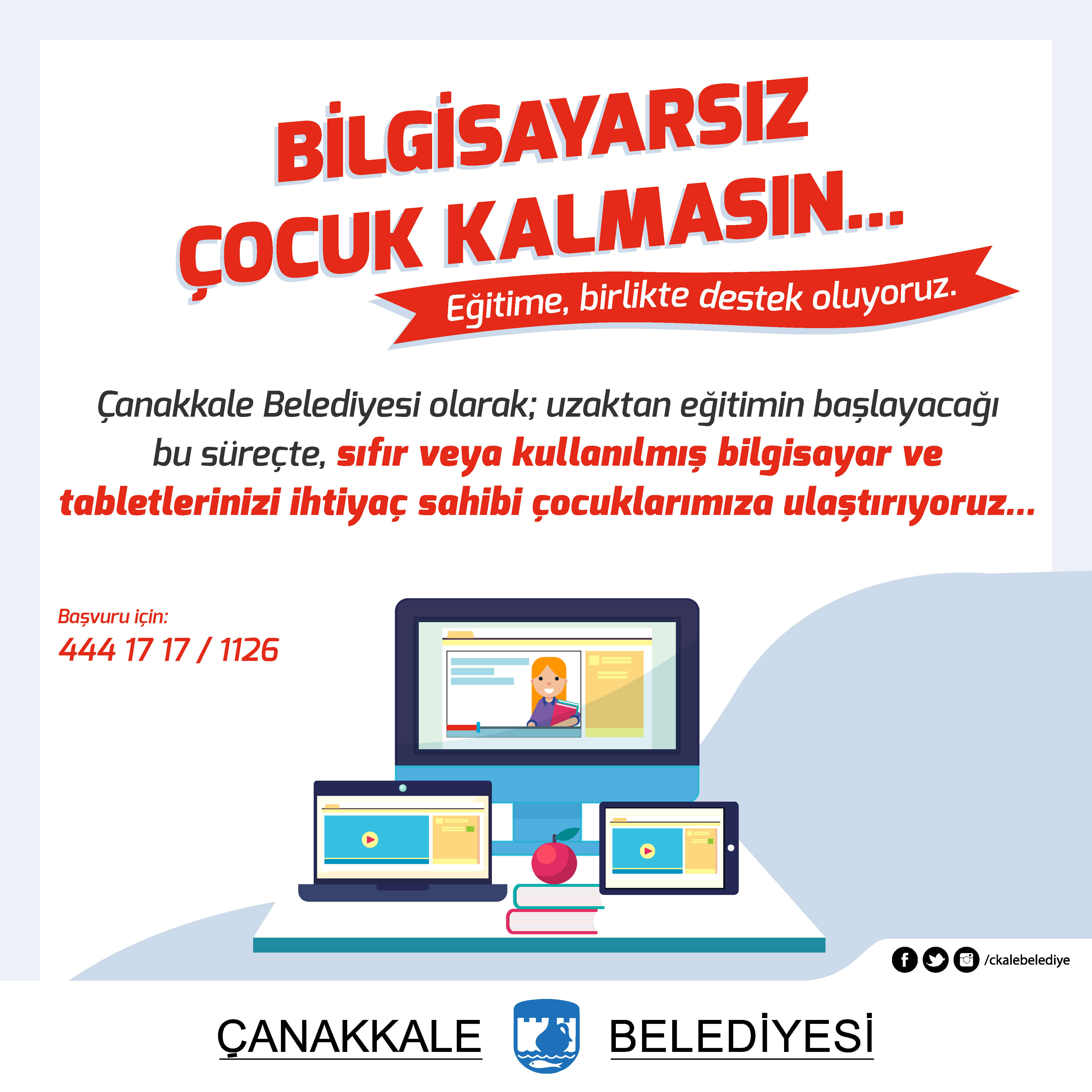 Çanakkale Belediyesi, bu noktada ihtiyaç sahibi öğrenciler ve bilgisayar bağışında bulunabilecek kentliler arasında bir köprü oluşturuyor. Bu doğrultuda, uzaktan eğitimin başlayacağı yeni dönemde sıfır veya kullanılmış bilgisayar ve tabletleriniz, Çanakkale merkez ve mücavir alan içerisinde ikamet eden ihtiyaç sahibi çocuklarımıza ulaştırılacak. Konuya ilişkin detaylı bilgi almak ve destek olmak için Çanakkale Belediyesi Sosyal Destek Hizmet Müdürlüğümüz ile 444 17 17 / 1126 numaralı telefondan iletişime geçebilirsiniz.